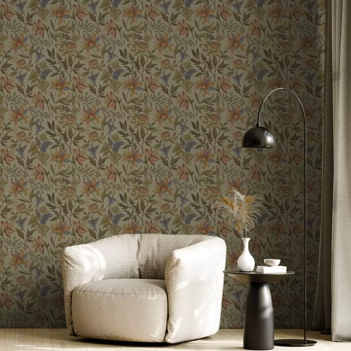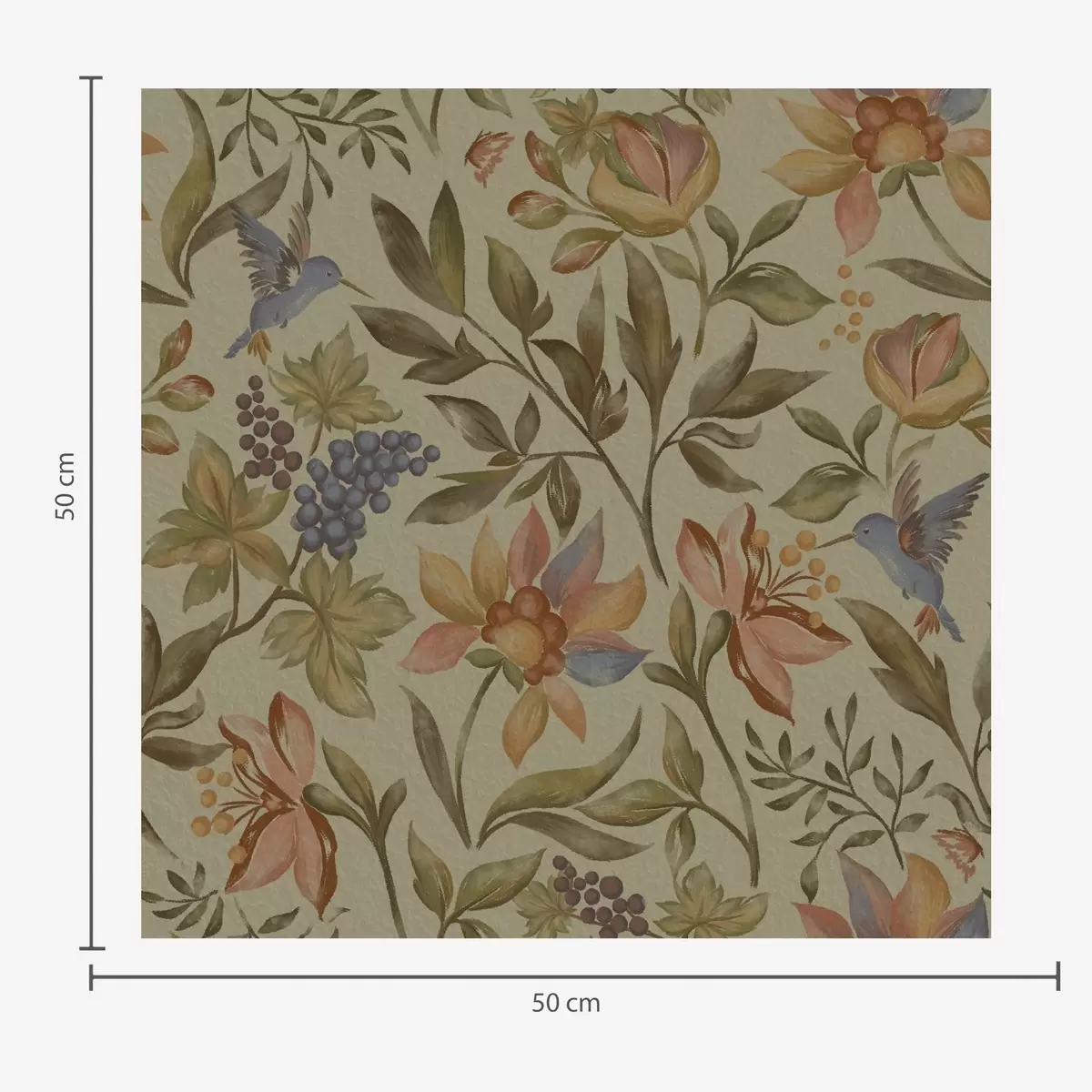 Wallpaper Vintage flowers and birds with grapes on an olive background a00594