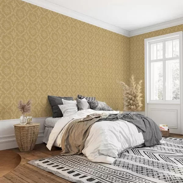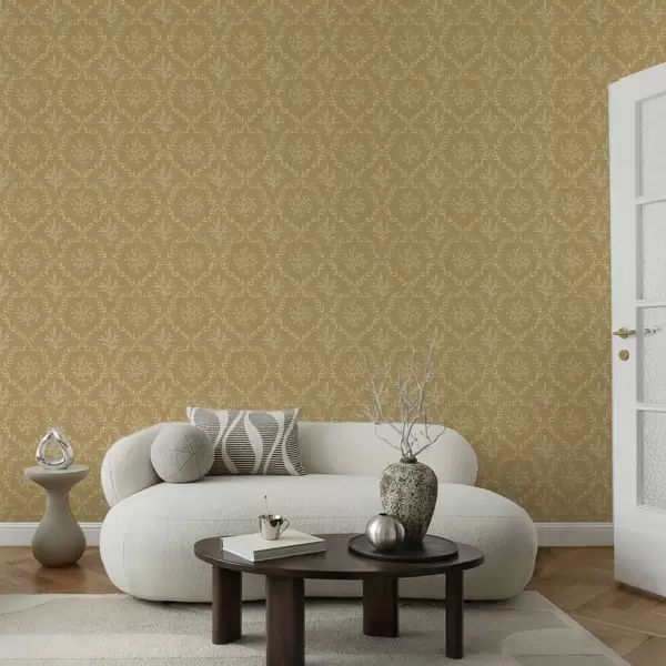 Wallpaper White wreaths of herbs and flowers on a mustard ground a00599