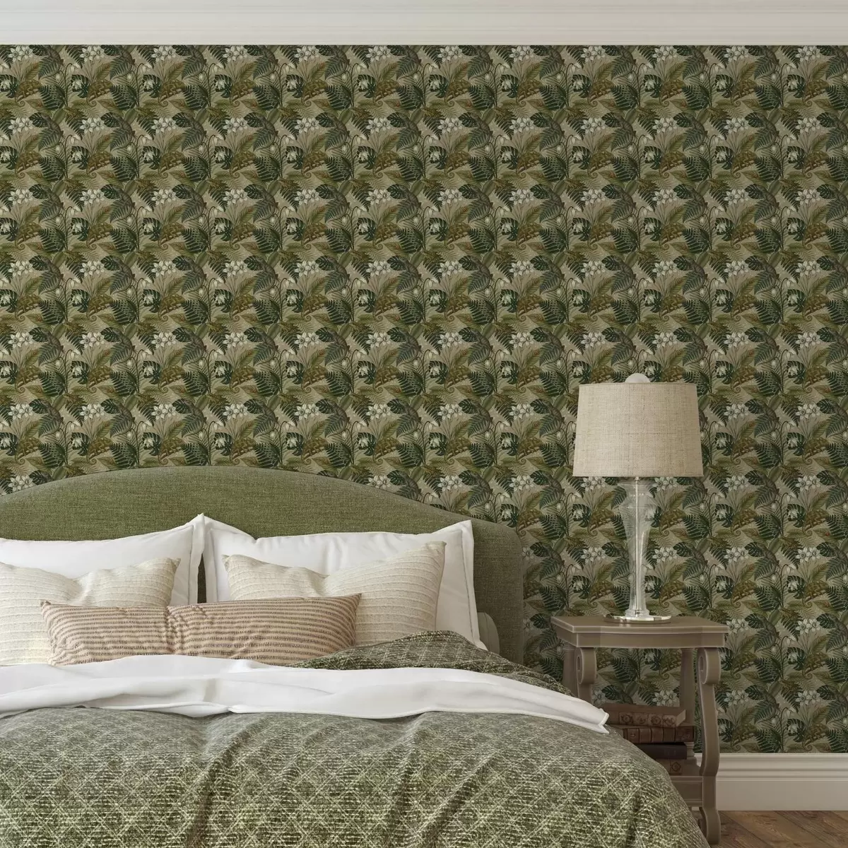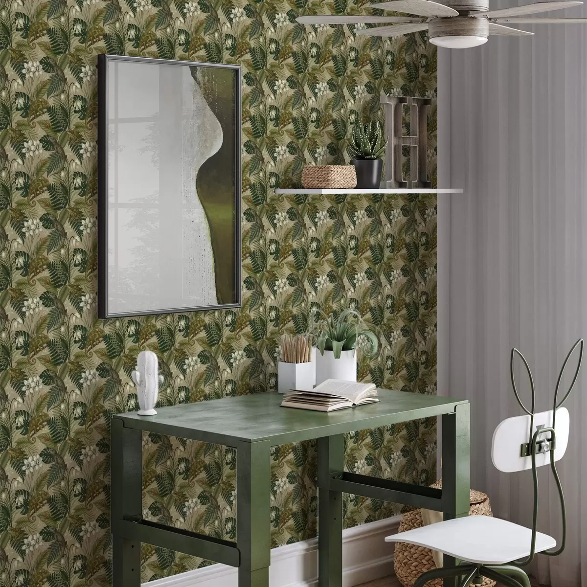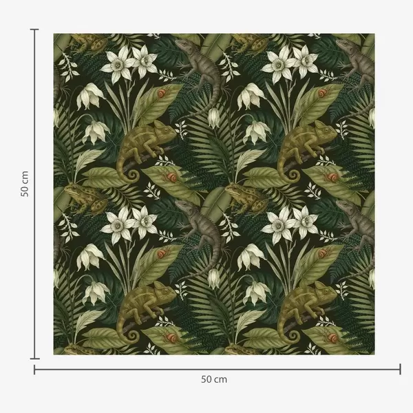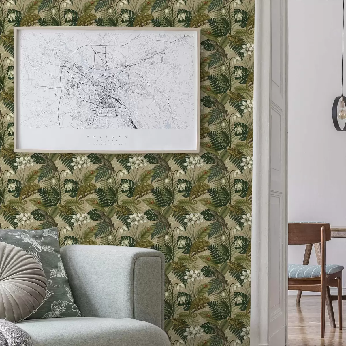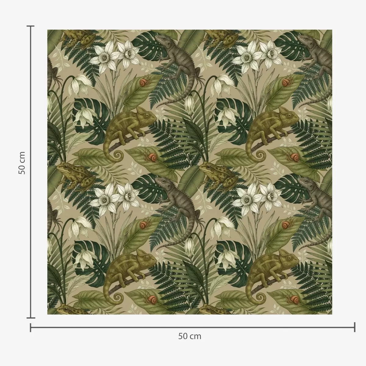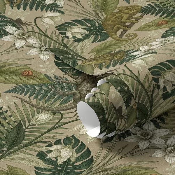 Wallpapers Chameleons and tropical leaves, white flowers, beige ground No. a00608