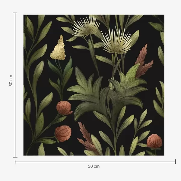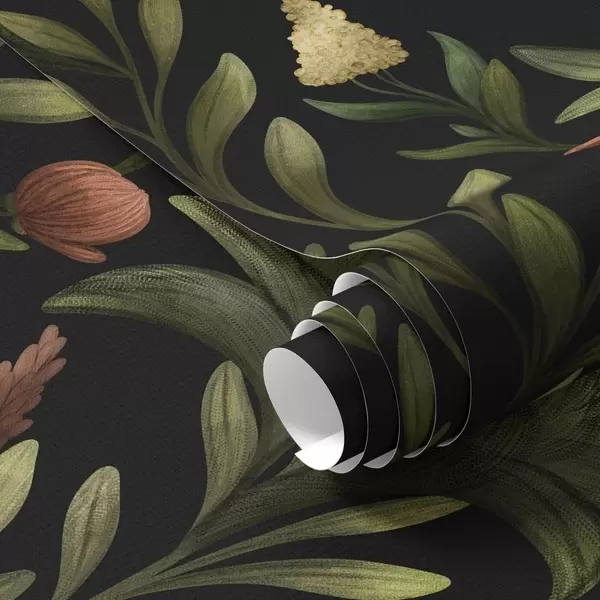 Wallpaper Tall grasses and blooms on black, detailed print a00620