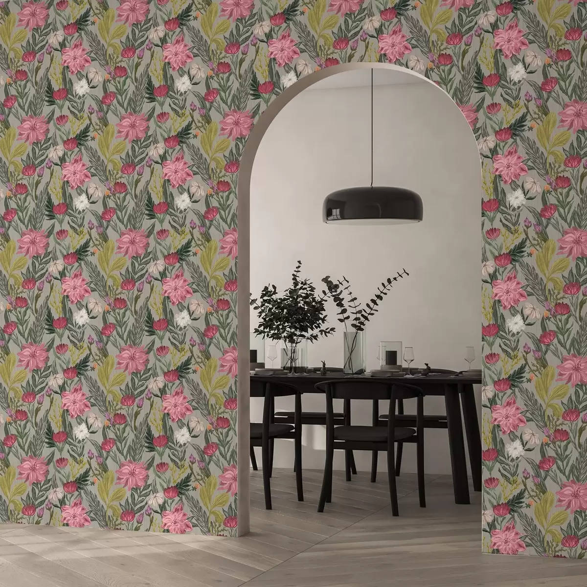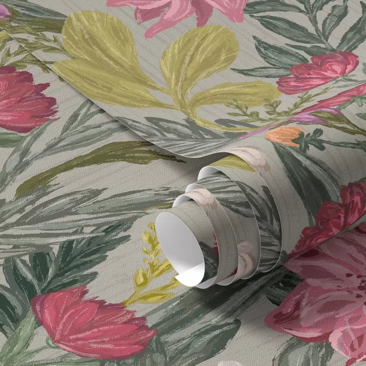 Wallpaper Lush pink and cream flowers on a gray background, impasto texture a00629