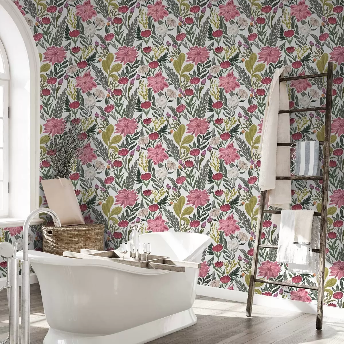 Wallpaper Lush pink and cream flowers on a white background, impasto texture a00629v1