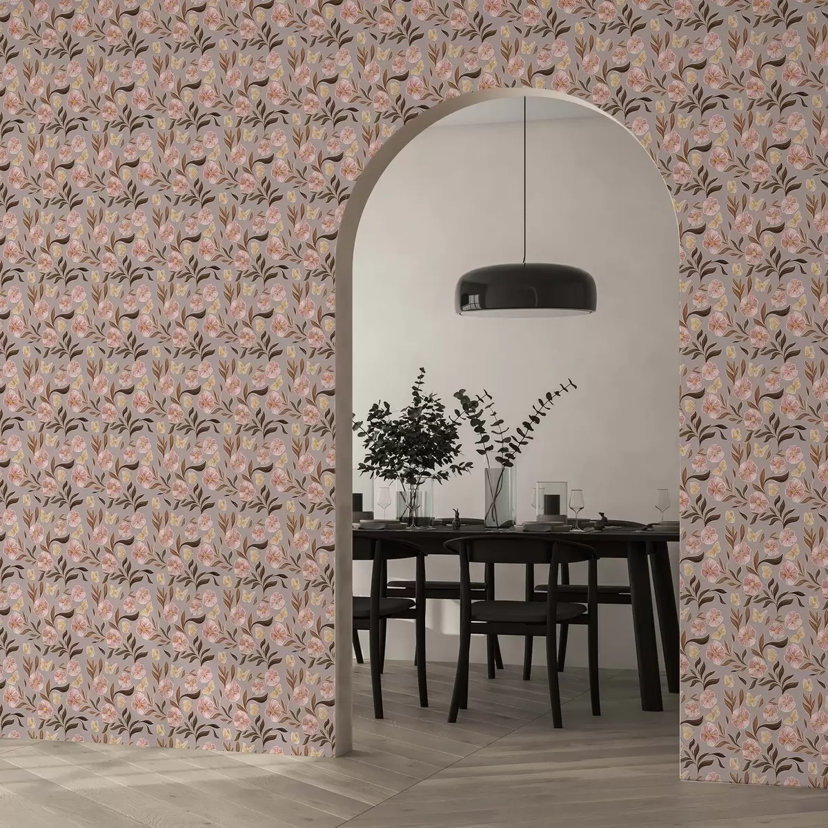 Wallpaper Pink flowers and butterflies on a gray-beige background a00633