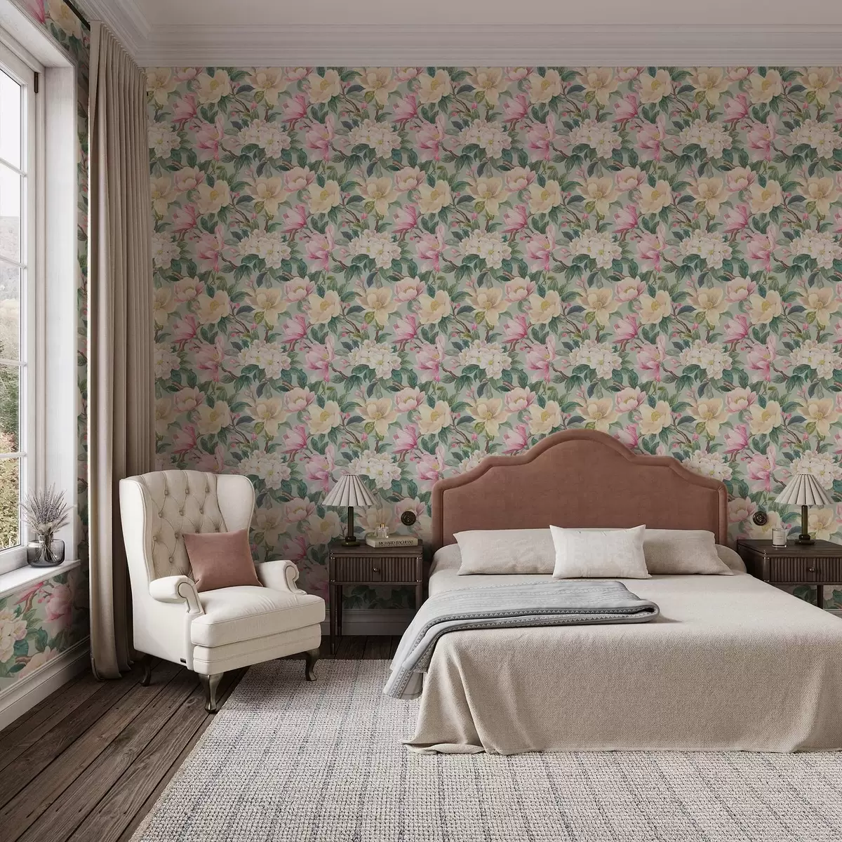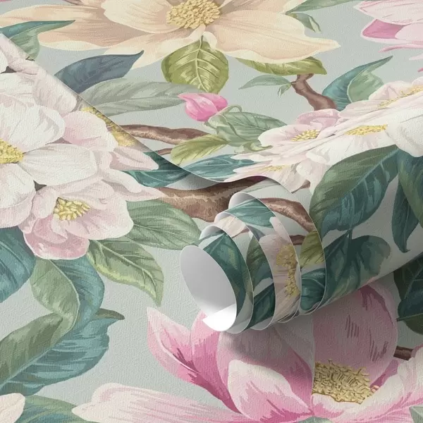 Wallpaper Magnolias and white blossoms on a mint-gray background a00644