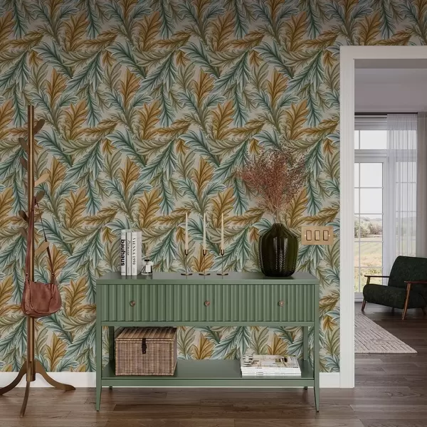 Wallpaper Decorative foliage in a warm ochre and green palette a00673