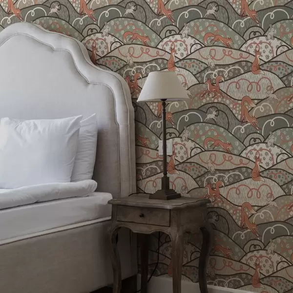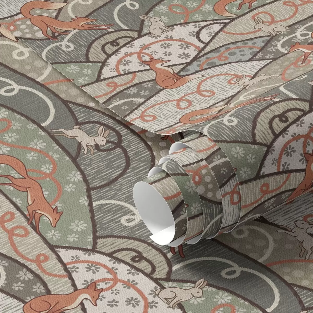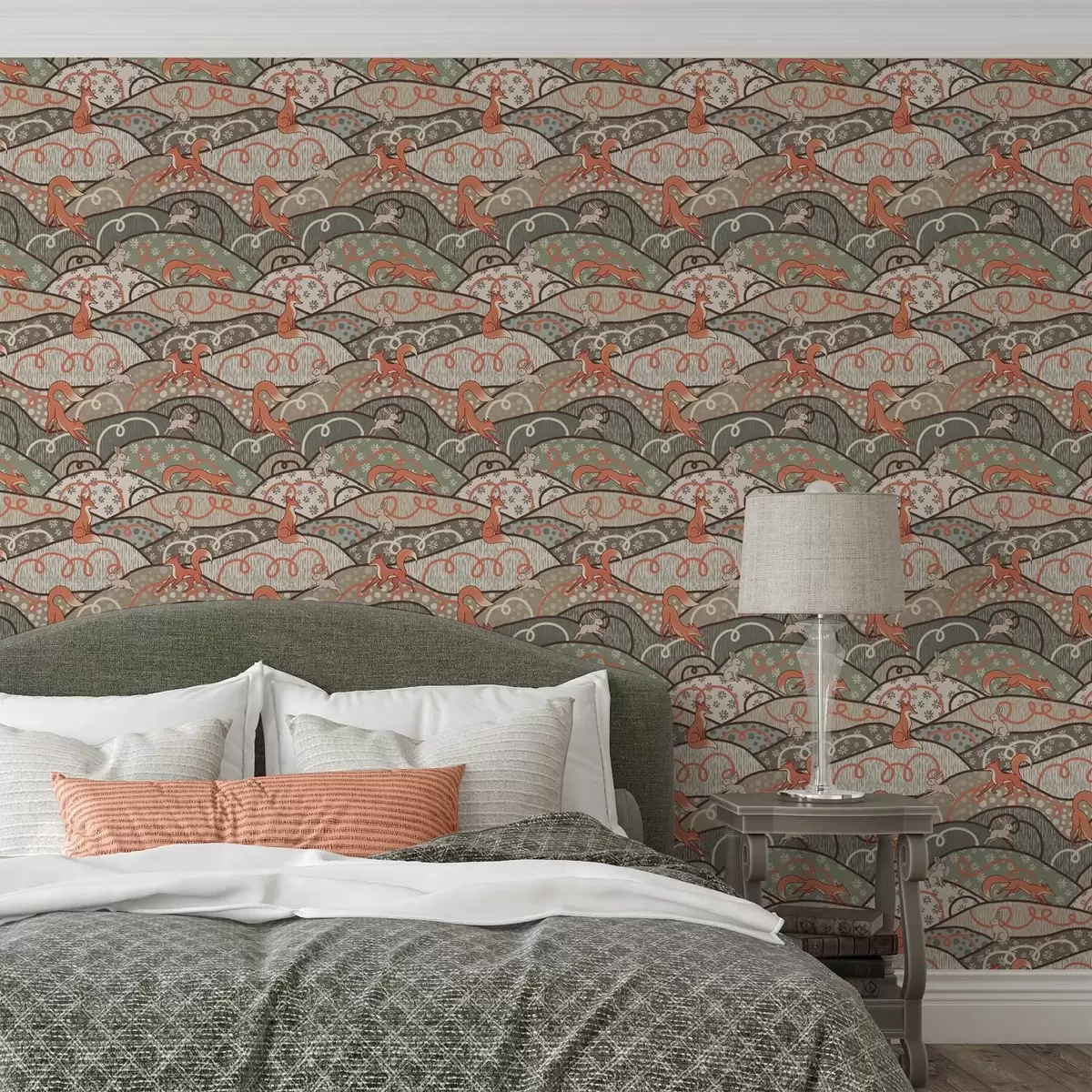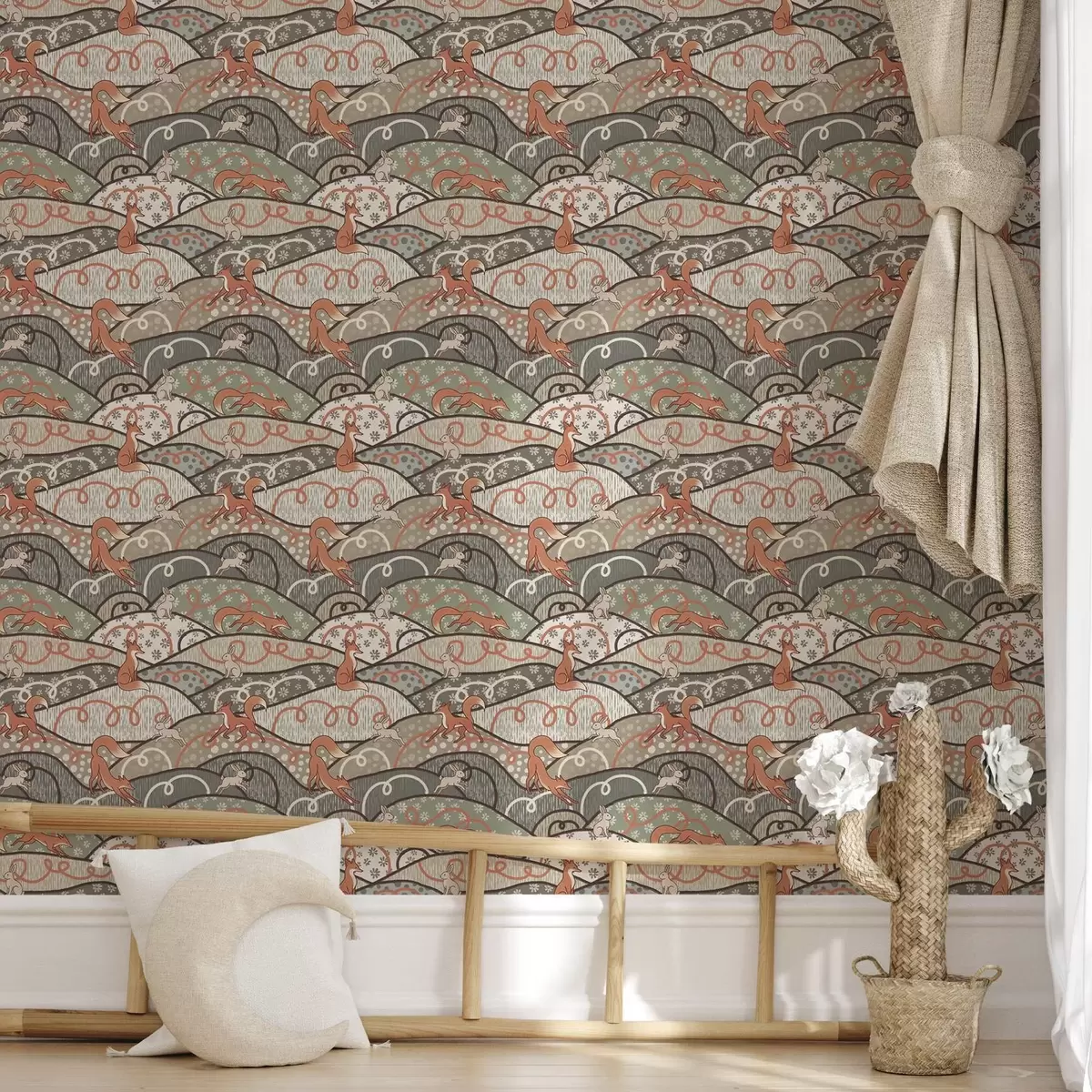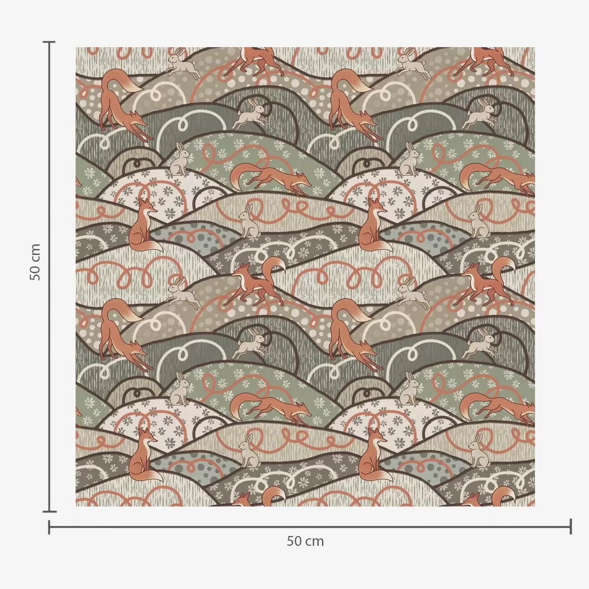Wallpapers Foxes and hares on wavy hills, retro pattern No. a00690