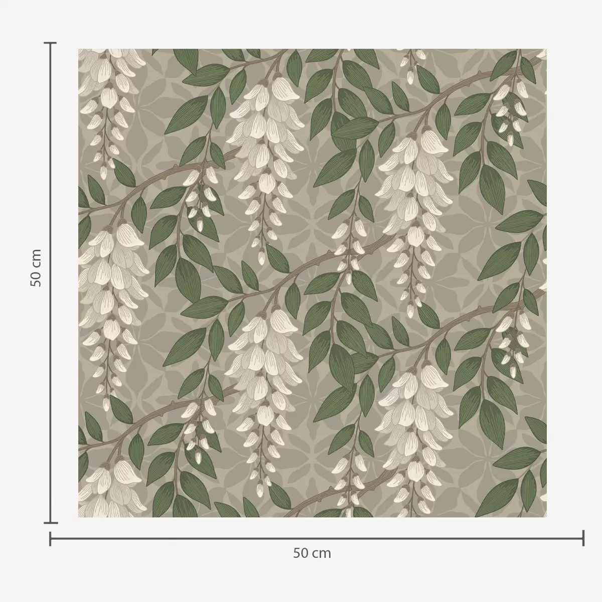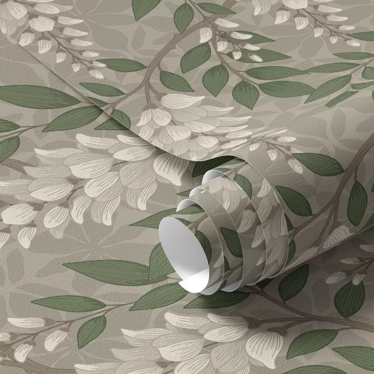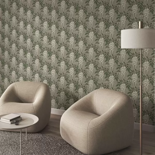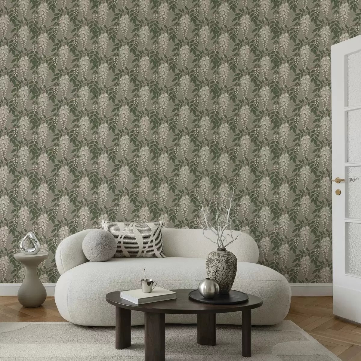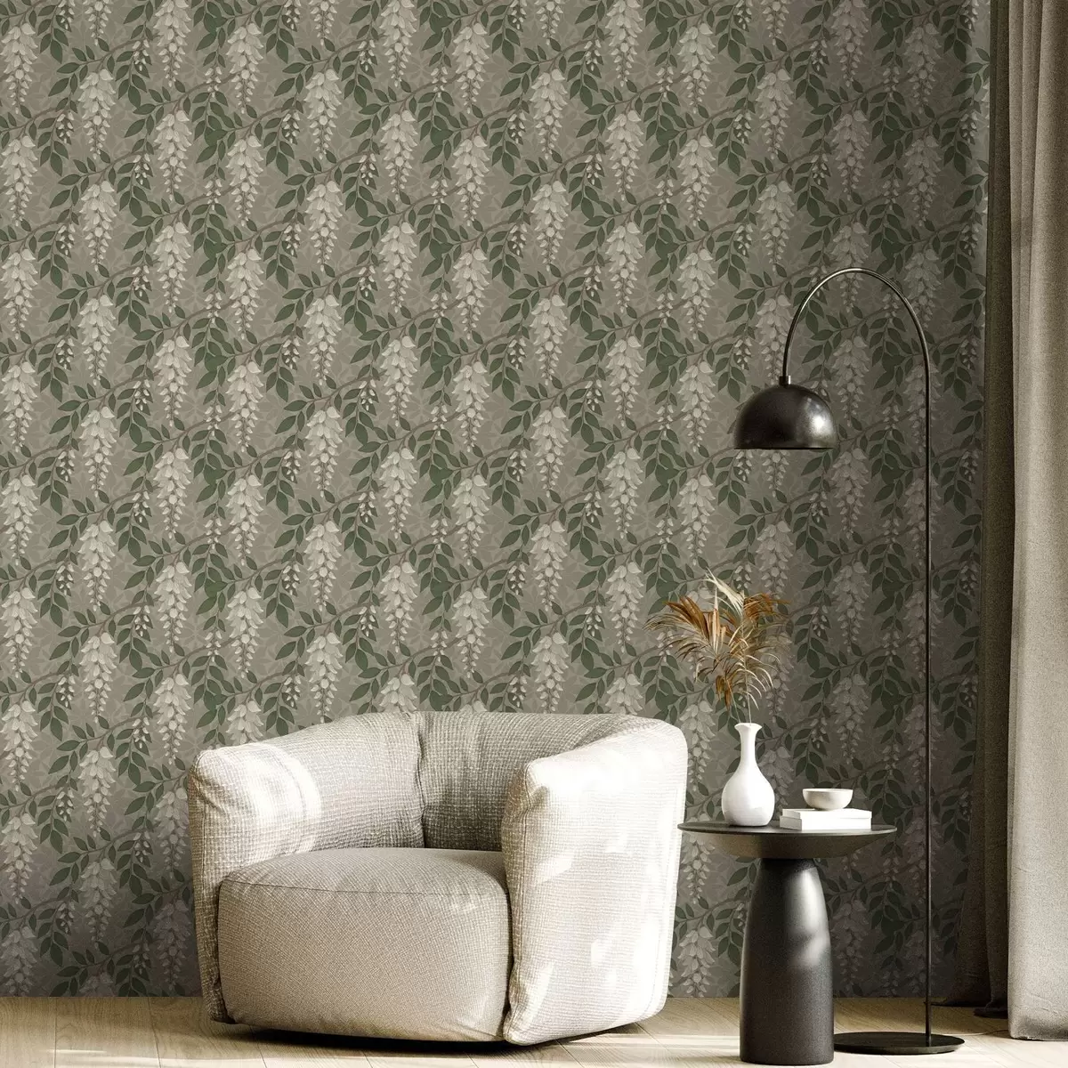 Wallpaper Light wisteria on a gray-olive background, cascading clusters a00694