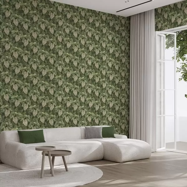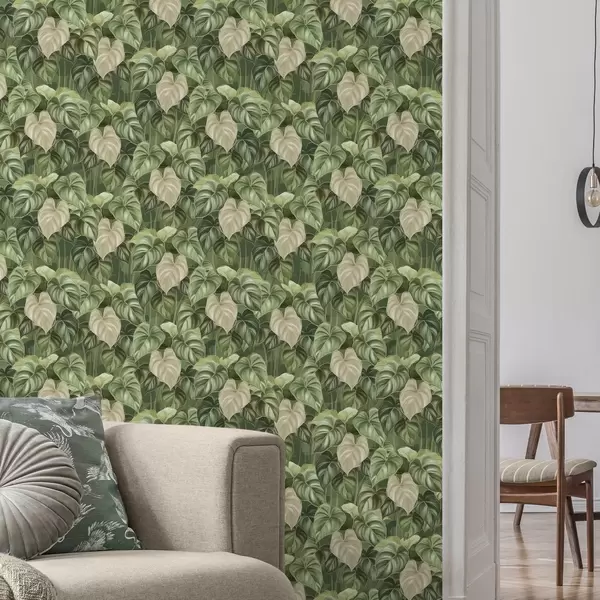 Wallpaper Lush philodendron leaves in shades of green and ivory a00695