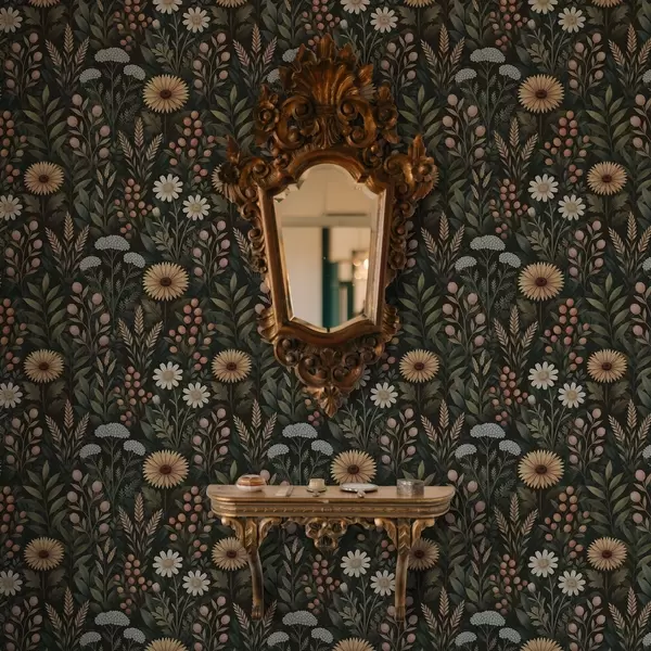 Wallpaper Wildflowers and berries on a dark background, natural ornament a00707