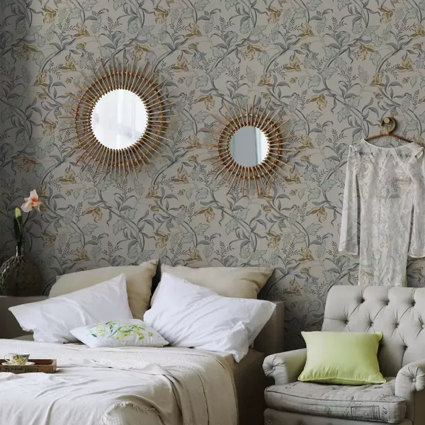 Wallpaper Vintage flowers with blue foliage on a cream background a00717
