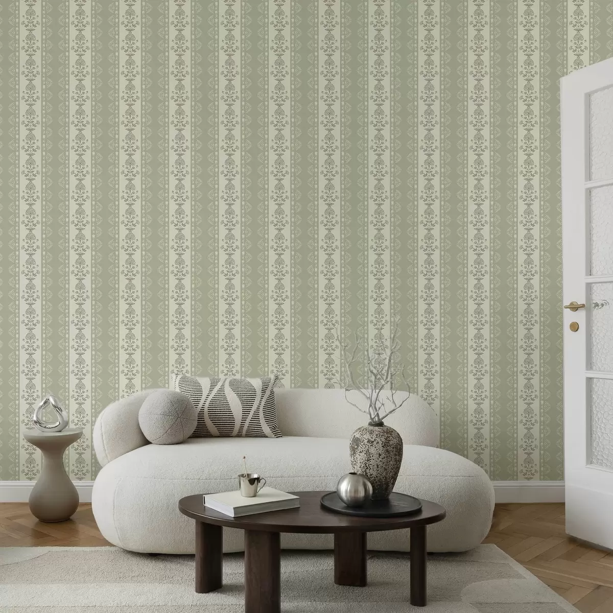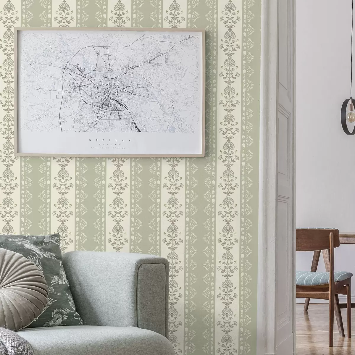 Wallpapers Striped ornament with floral columns in sage tones No. a00719