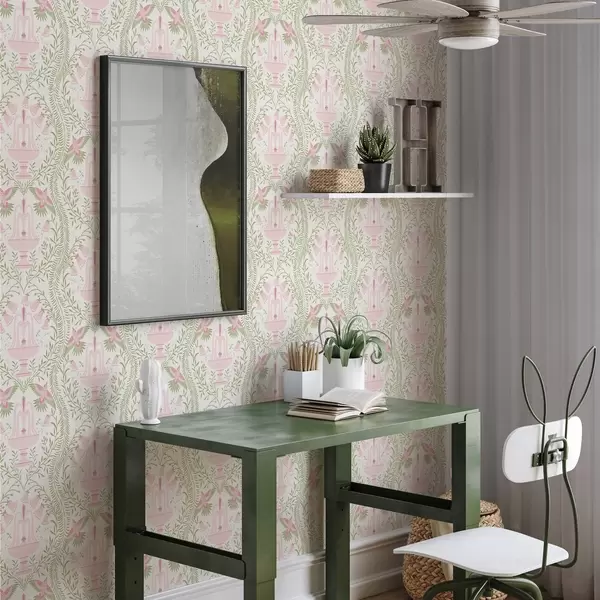 Wallpaper Fountains, hummingbirds and green scrolls on a light background a00723