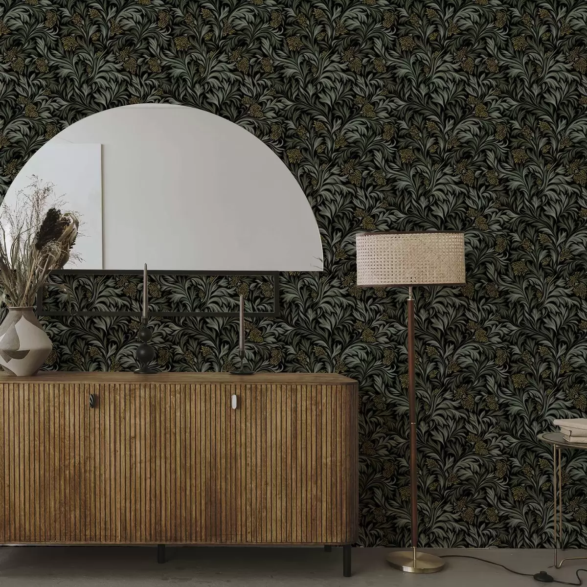Wallpapers Dark acanthus leaves with yellow cones on black No. a00745