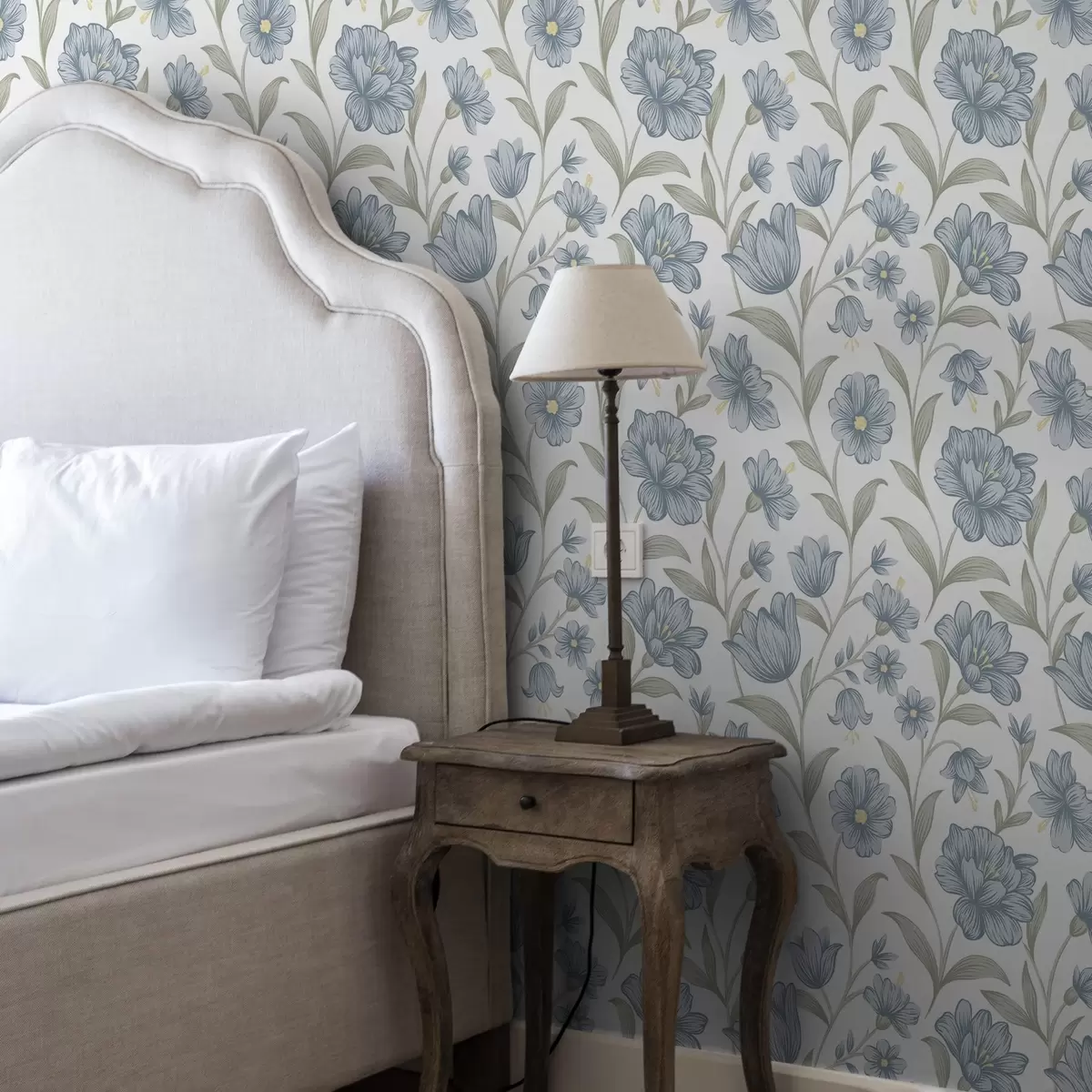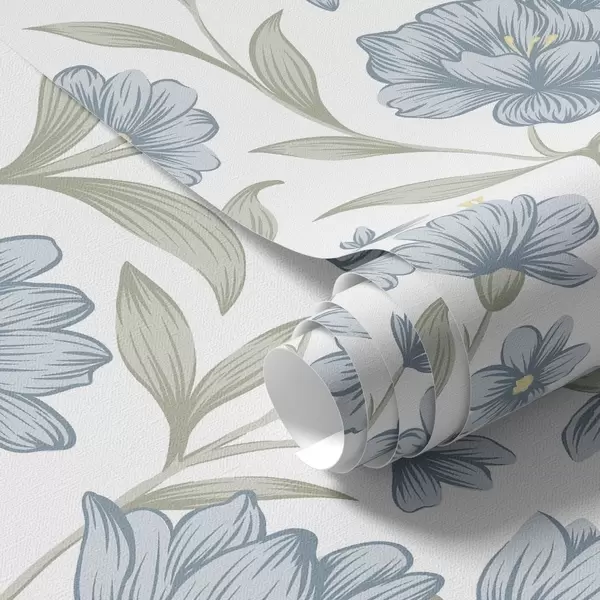 Wallpapers Dusty blue flowers with olive leaves on white No. a00780