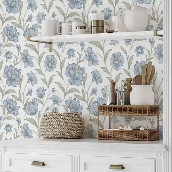 Wallpapers Dusty blue flowers with olive leaves on white No. a00780