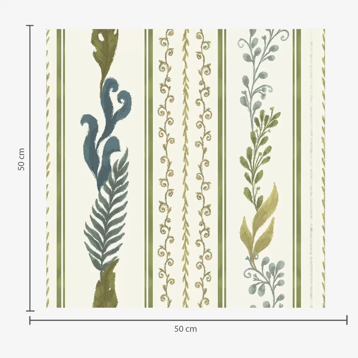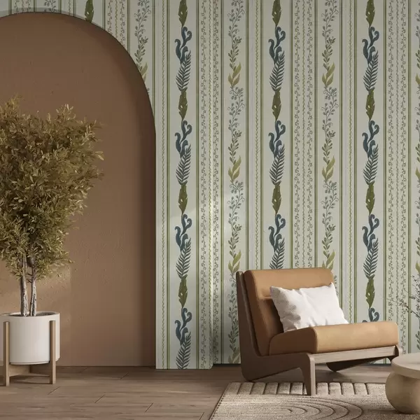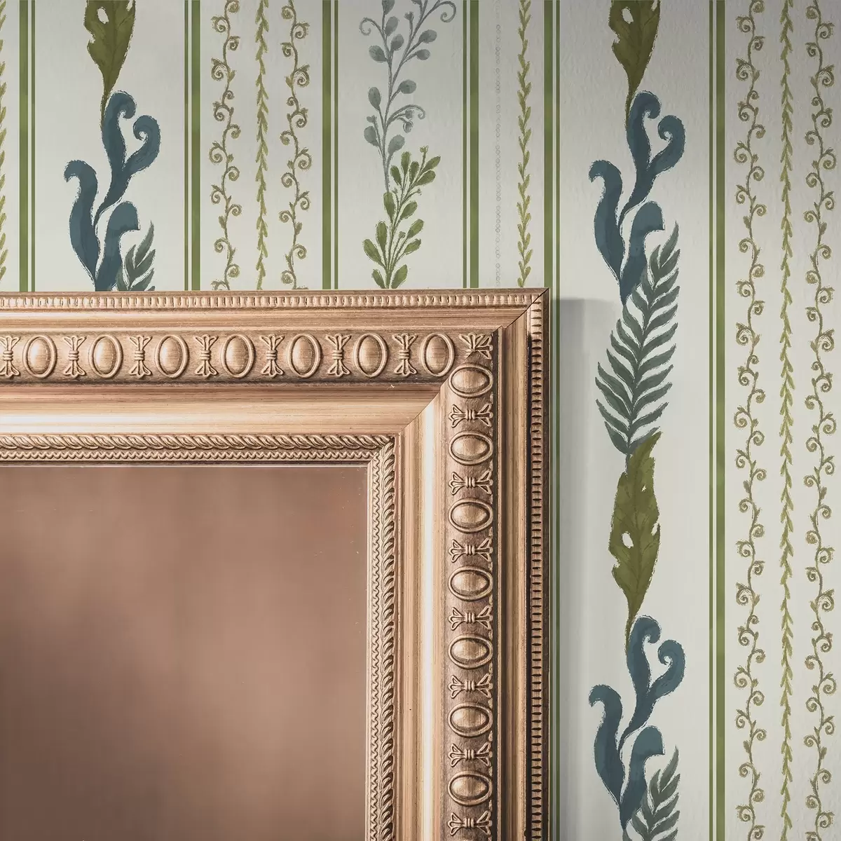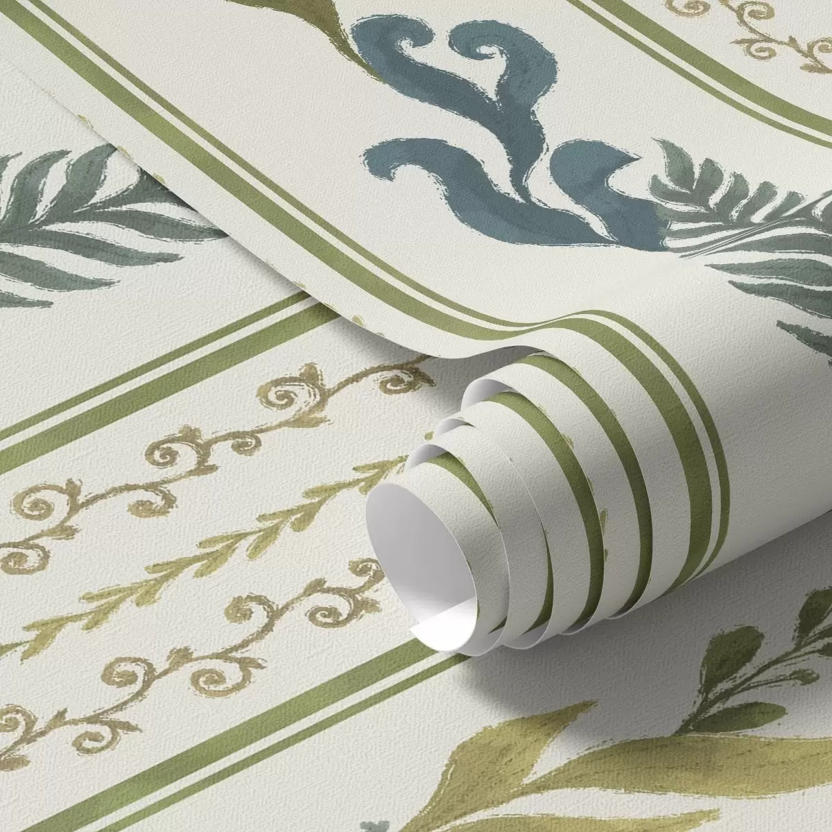 Wallpapers Stripes with scroll ornament and large branches in greens No. a00823