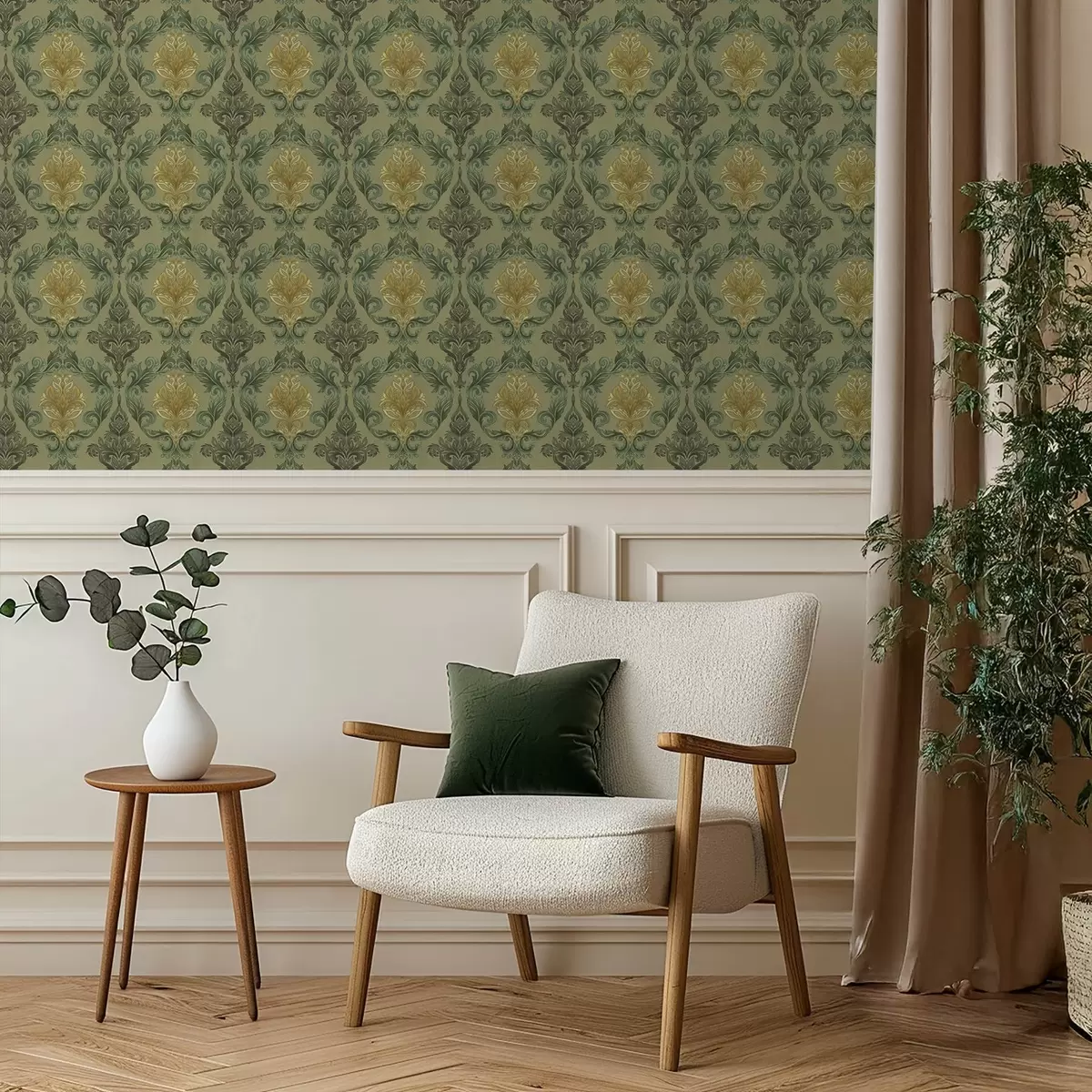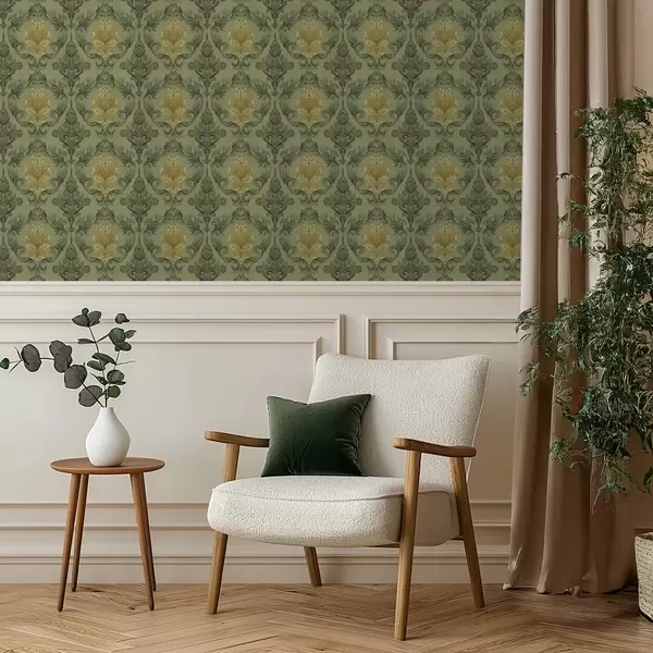 Wallpapers Damask with vegetal scrolls, olive-ochre palette No. a00828