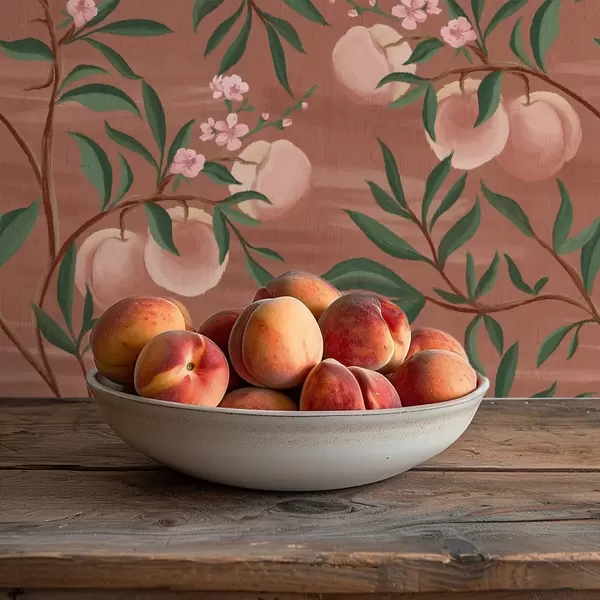 Wallpaper Peaches on branches with pink blossom, terracotta ground a00856