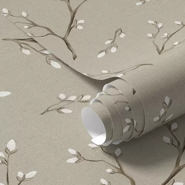 Wallpapers Twigs with white buds on linen taupe background No. a00861