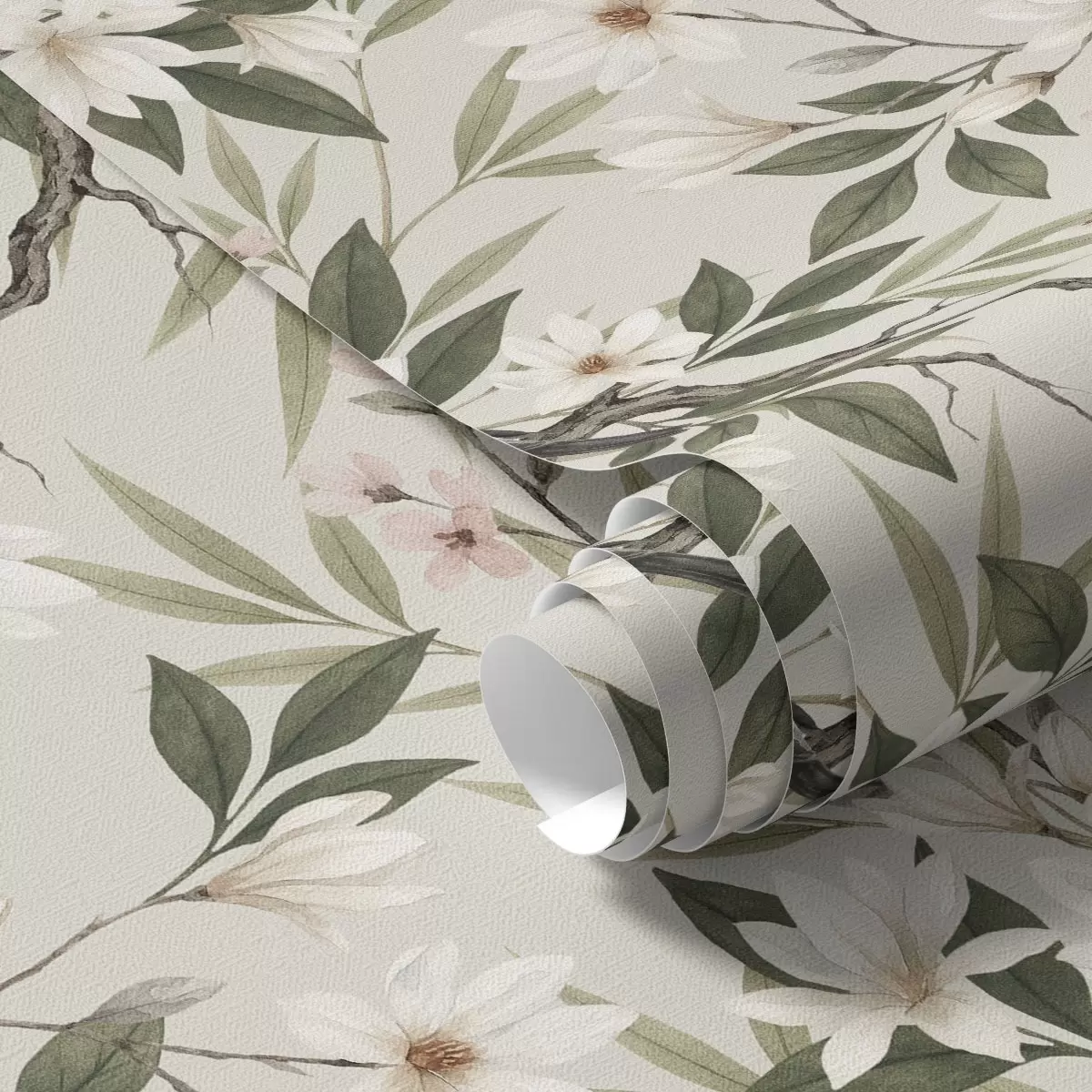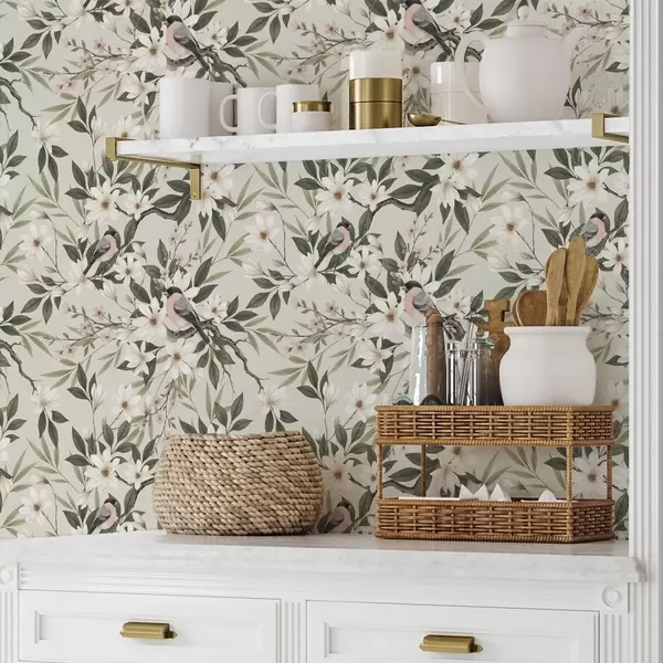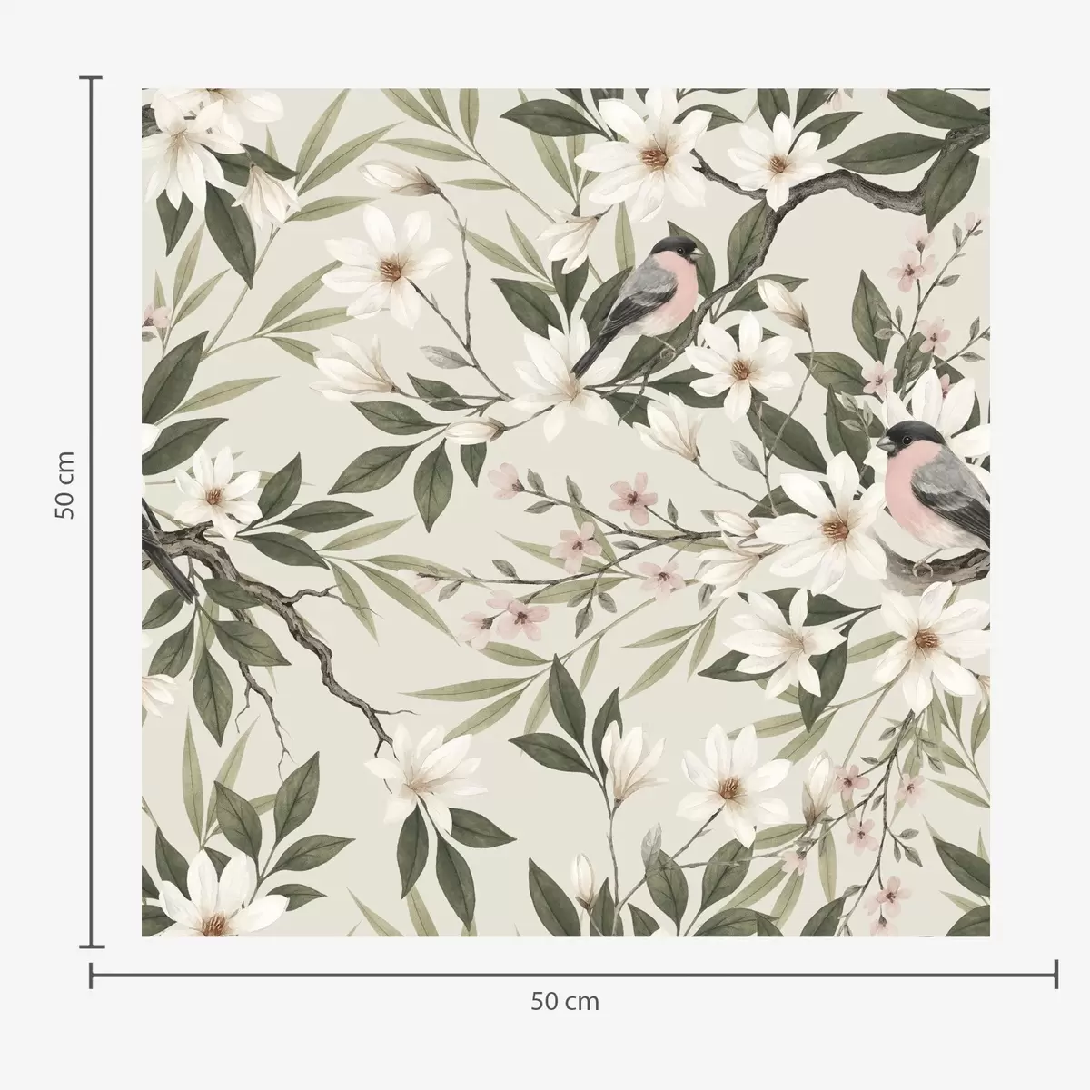 Wallpaper Bullfinches with white chests on branches with cream flowers a00889