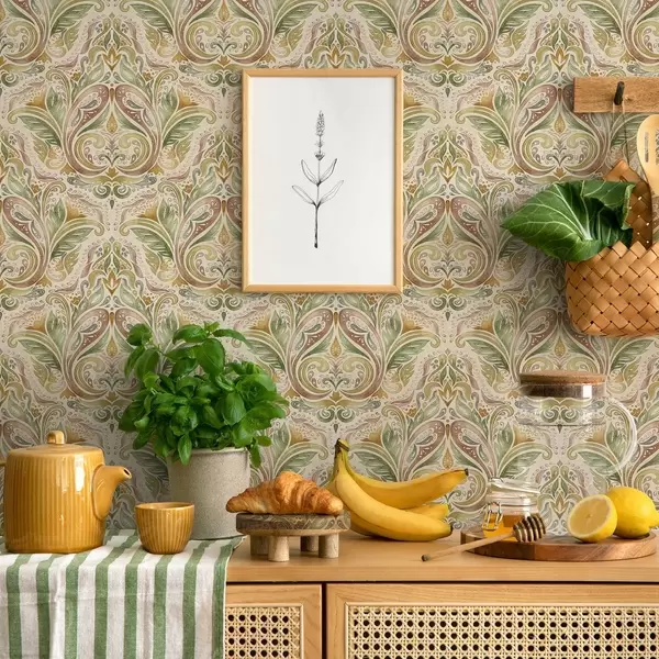 Wallpaper Watercolour leafy swirls in green and warm ochre tones a00927