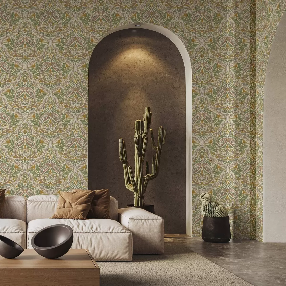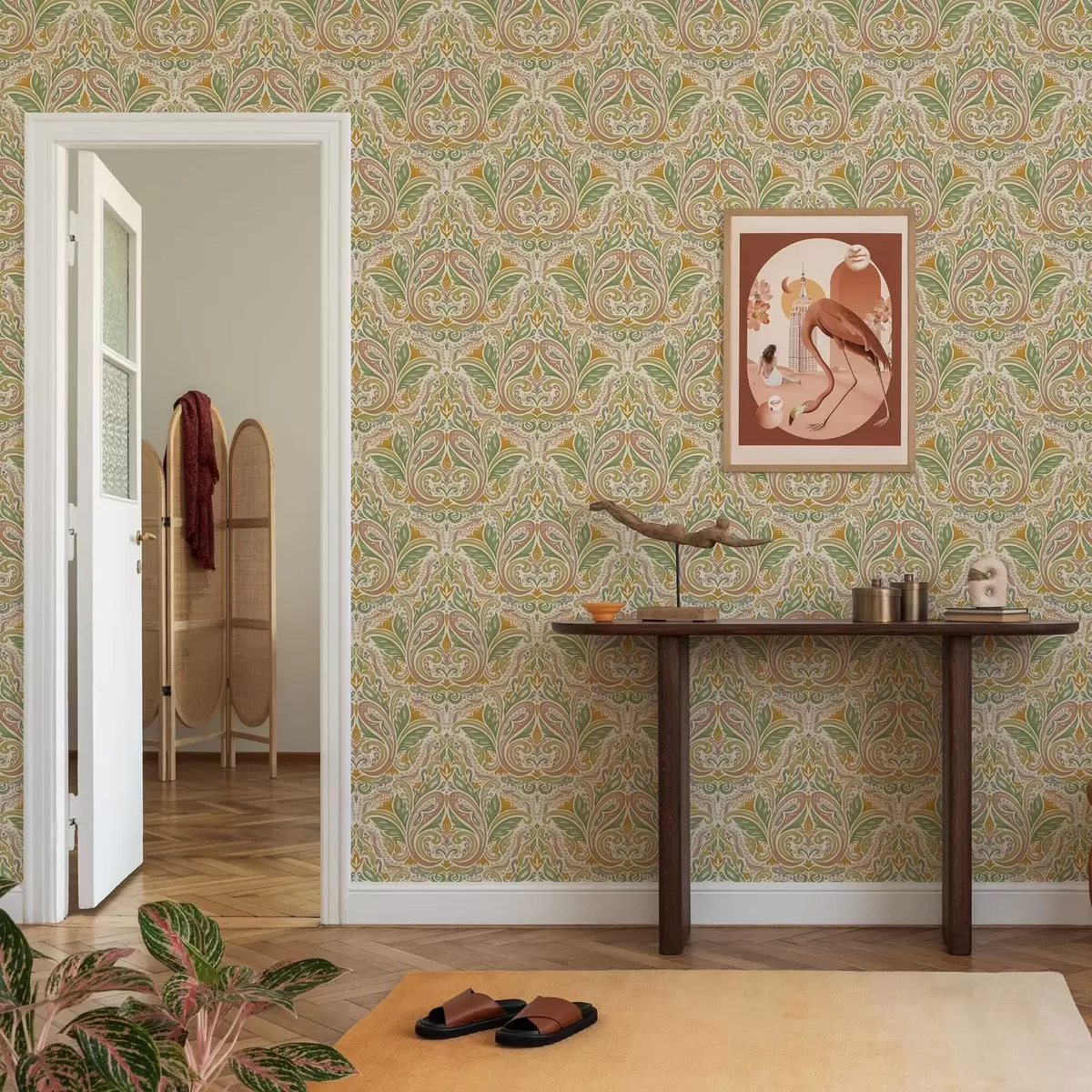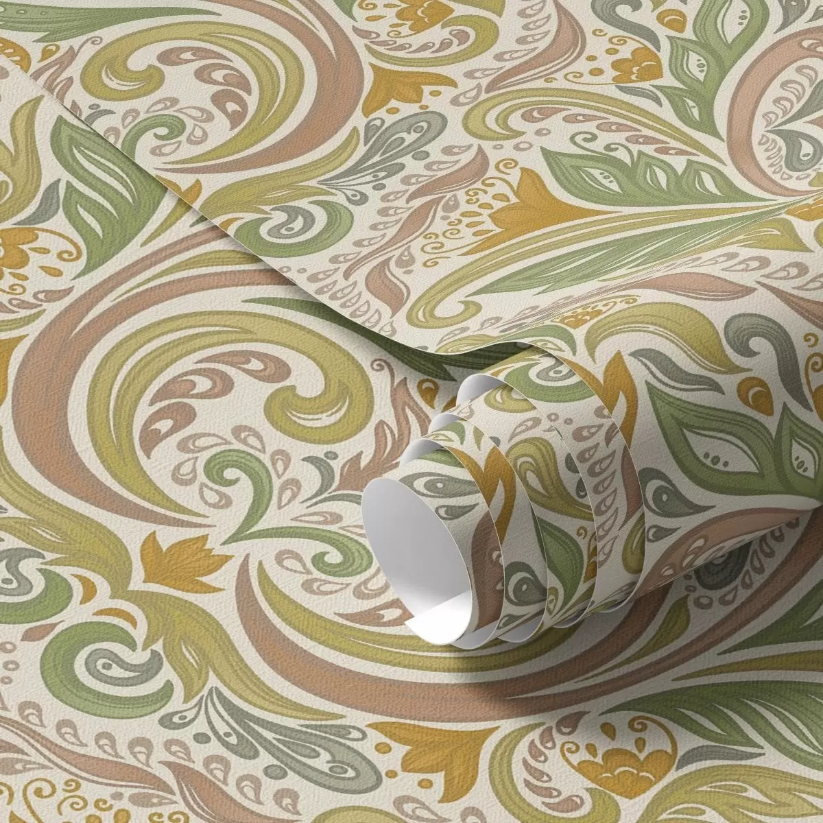 Wallpapers Ornamental leafy swirls in green and terracotta tones No. a00927v1