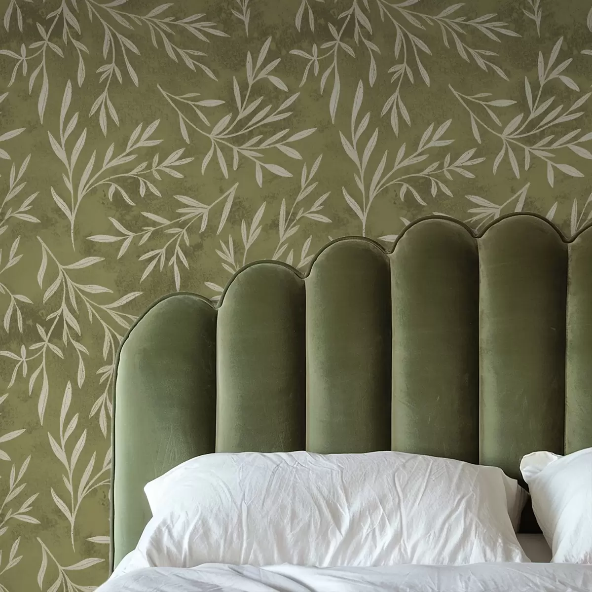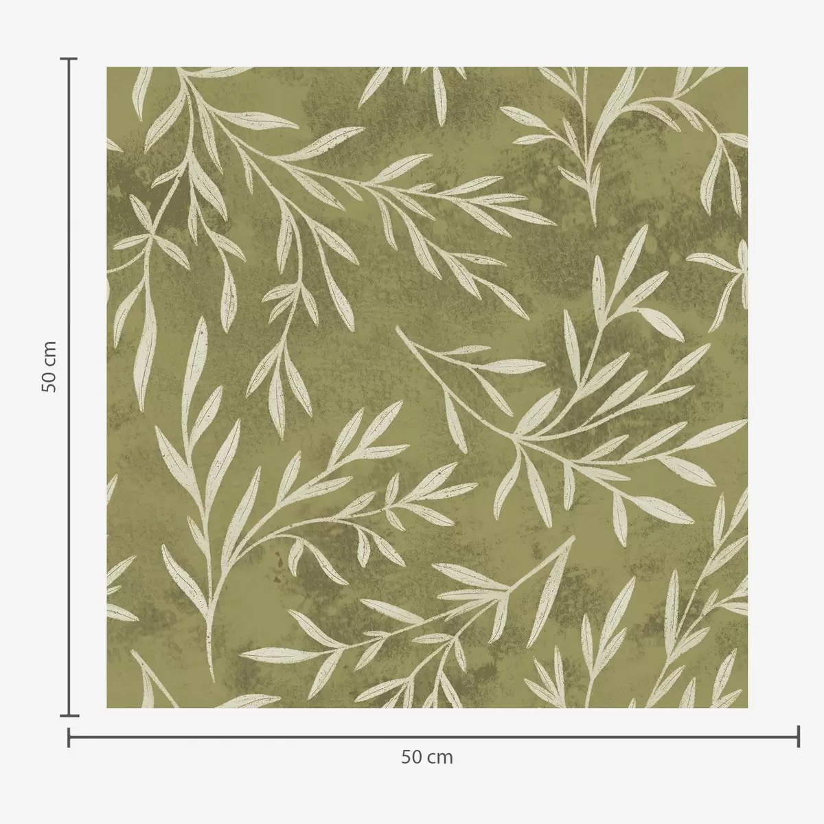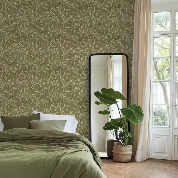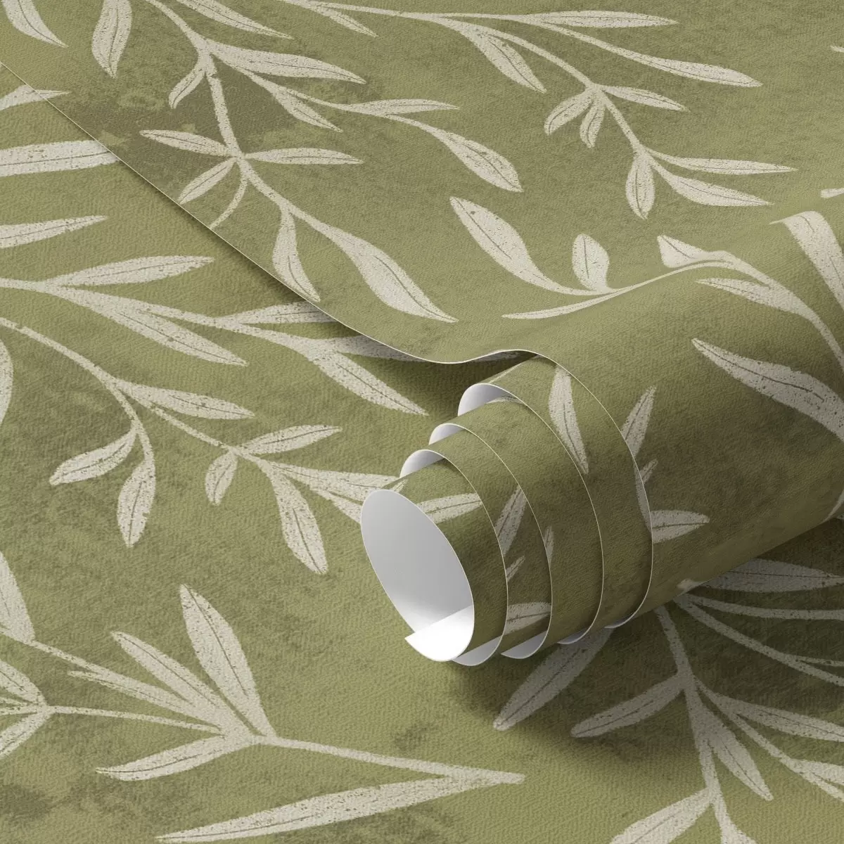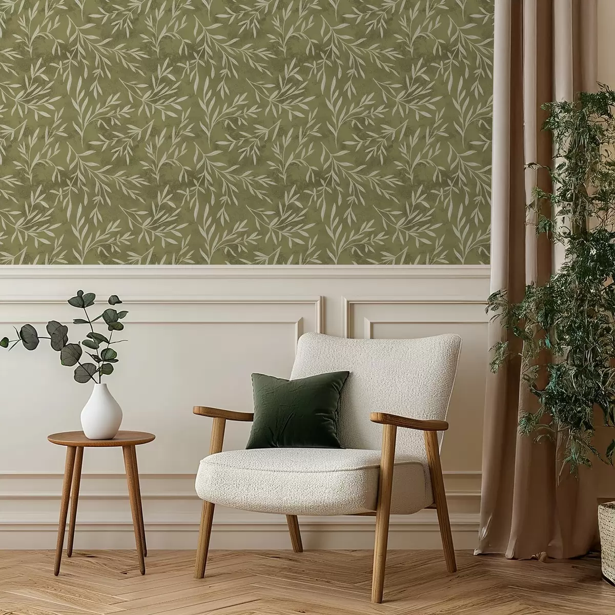 Wallpapers Cream-white sprigs on a warm olive textured background No. a00936v1
