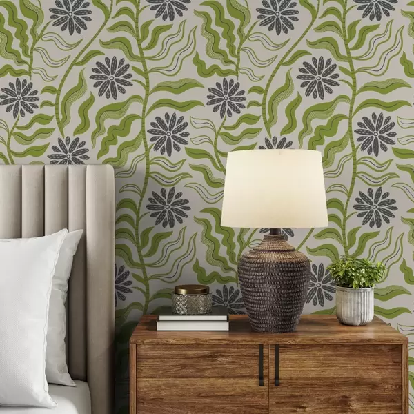 Wallpapers Playful green daisies with wavy leaves on a cream background No. a00998