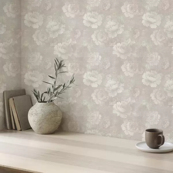 Wallpapers Faded peonies on linen texture in a soft beige palette No. a01018