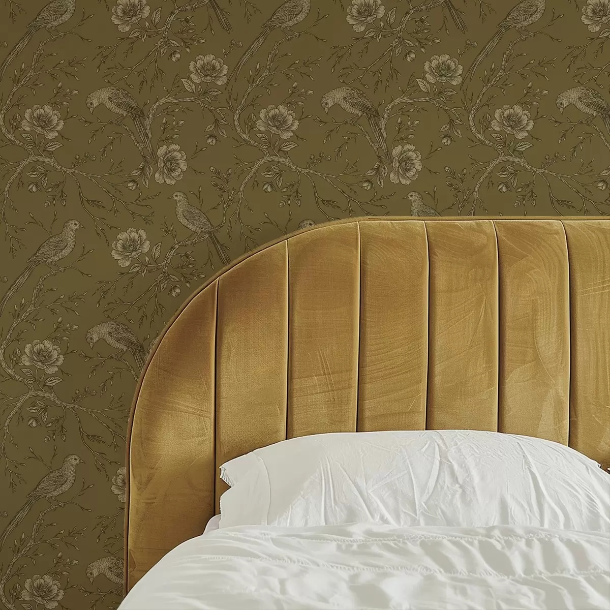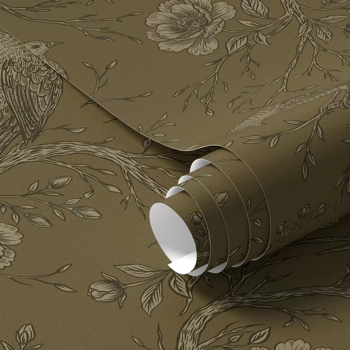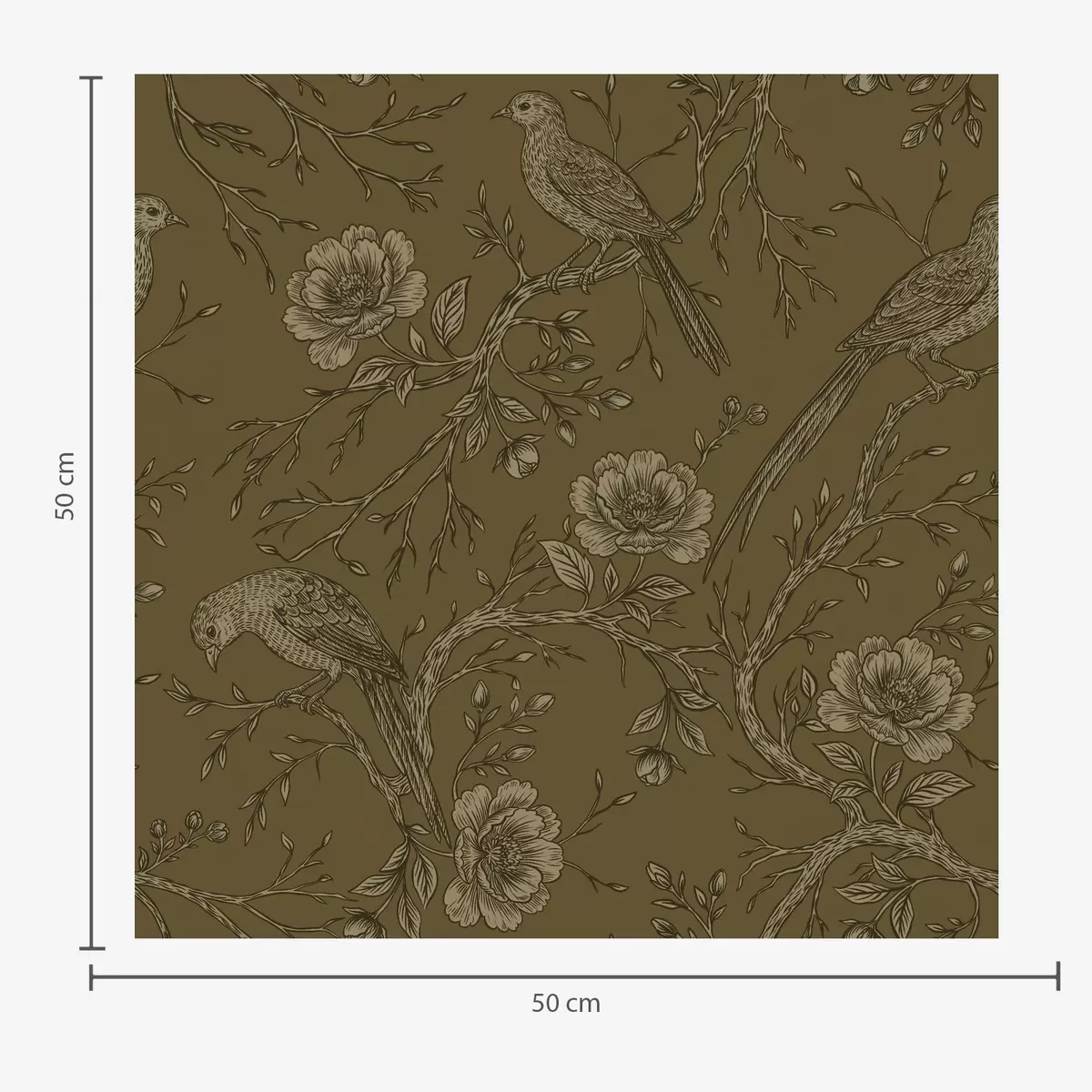 Wallpapers Vintage birds and flowers on a warm olive background No. a01022v1
