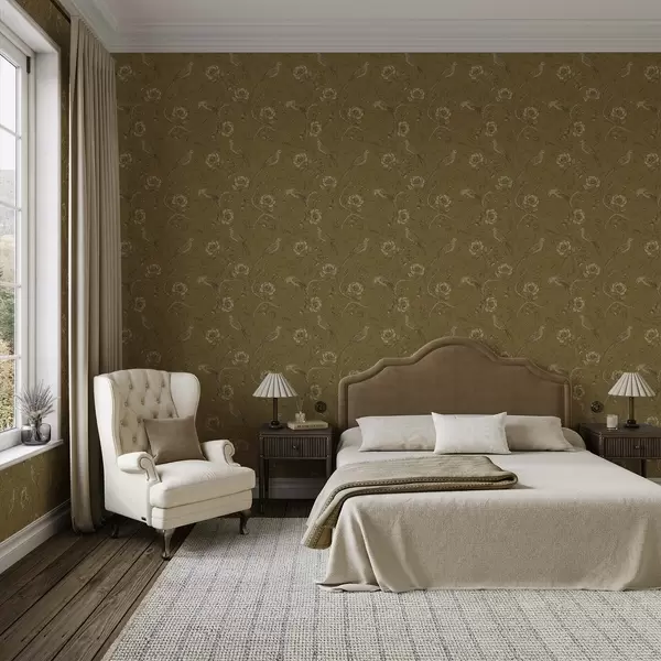 Wallpapers Vintage birds and flowers on a warm olive background No. a01022v1