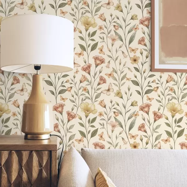Wallpapers Delicate peach flowers and butterflies on a warm cream background No. a01026