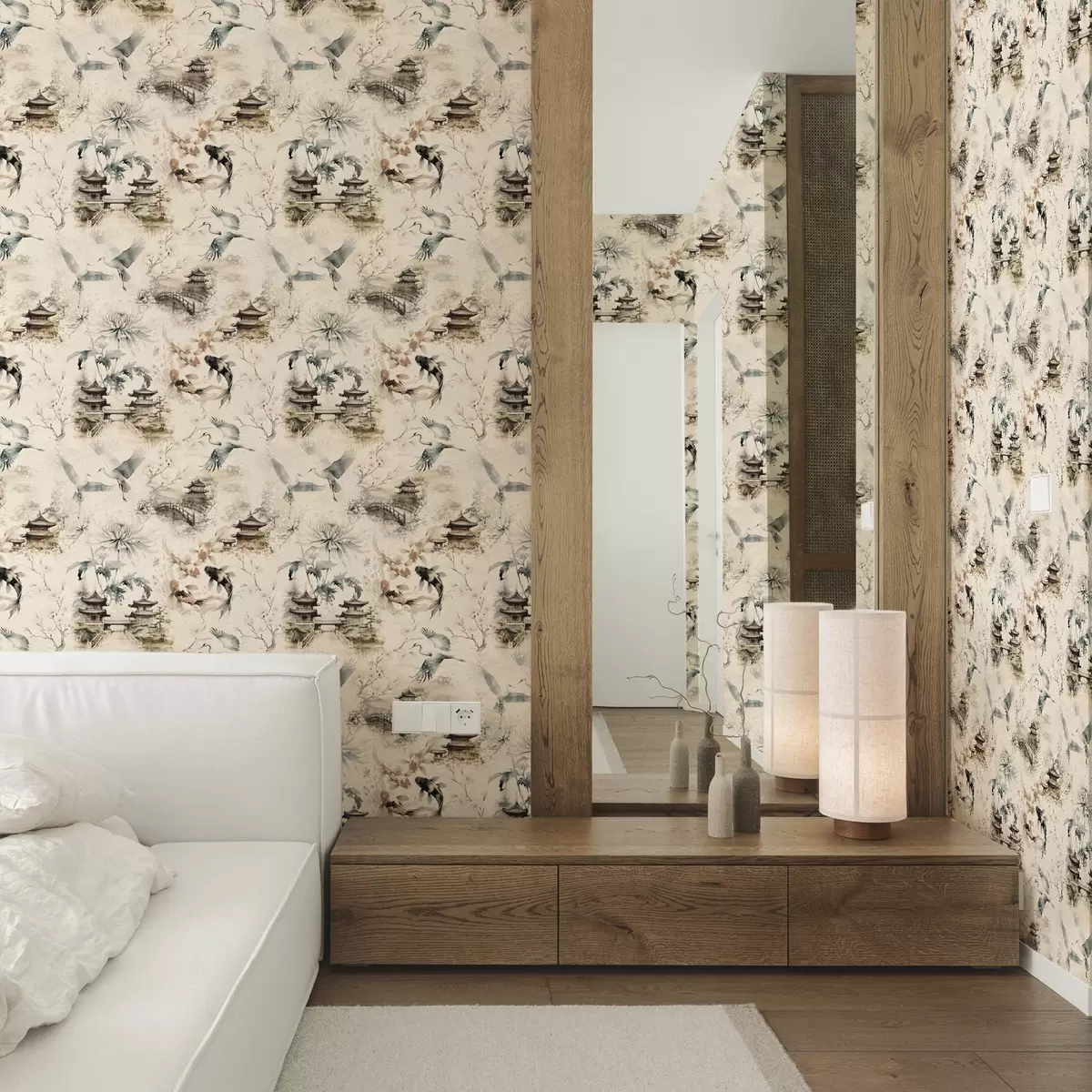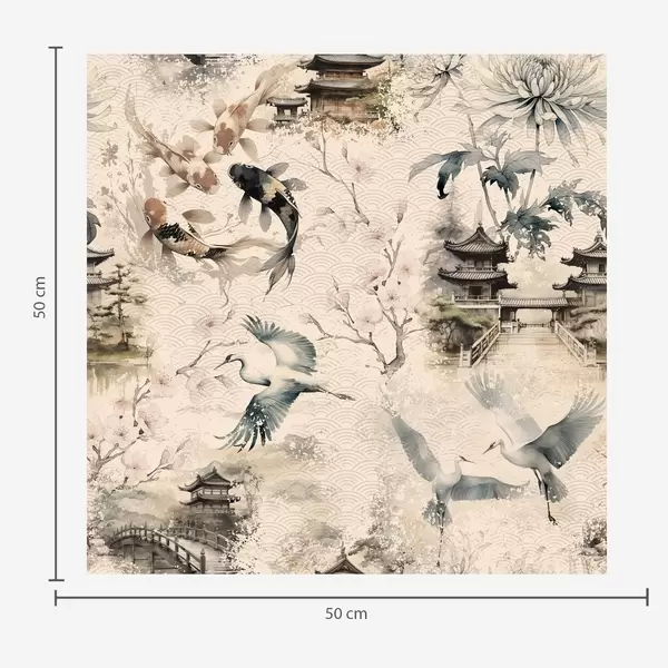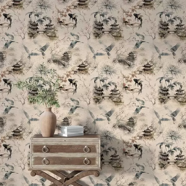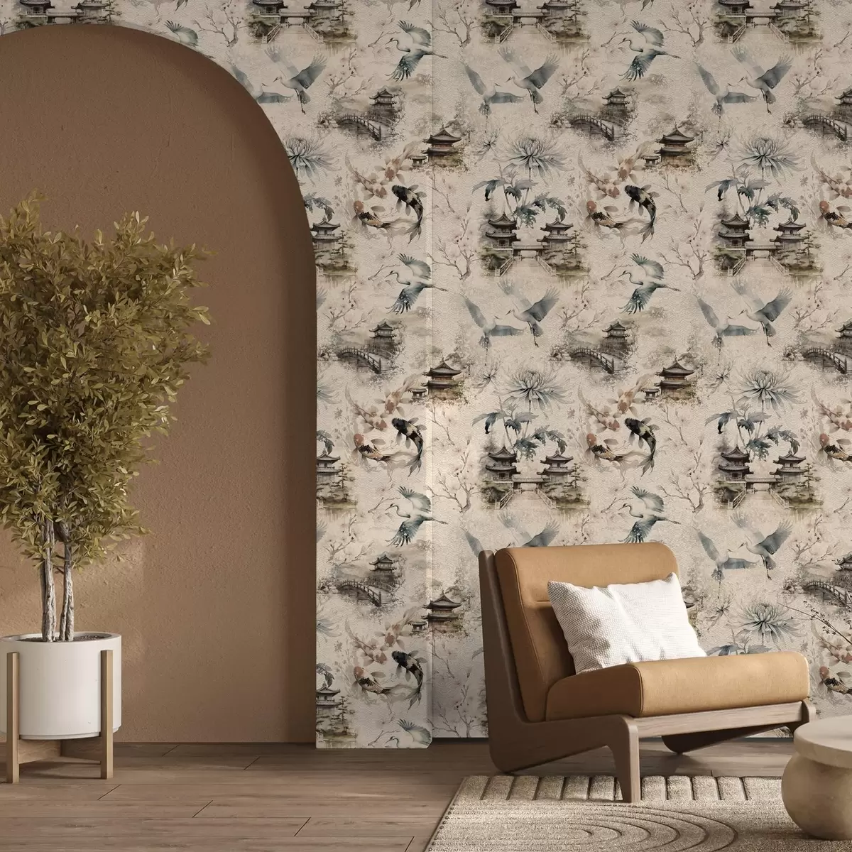 Wallpapers Japanese temples, koi fish and cranes on a soft background No. a01040