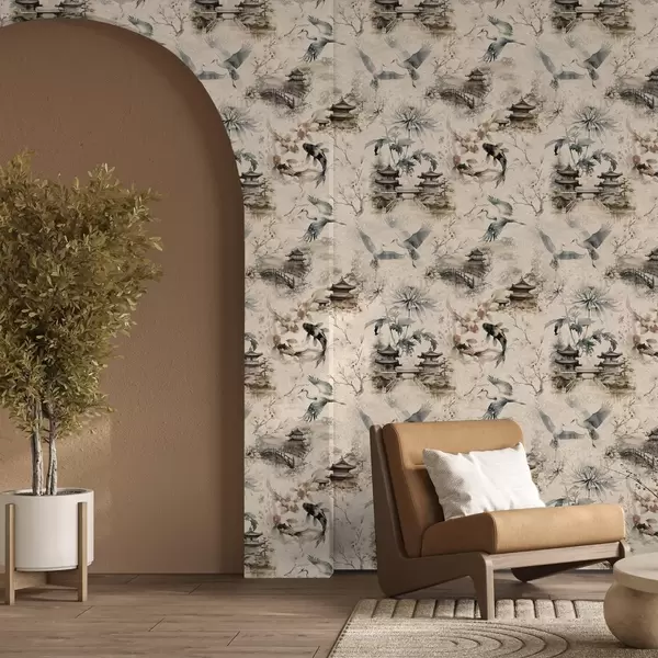 Wallpapers Japanese temples, koi fish and cranes on a soft background No. a01040