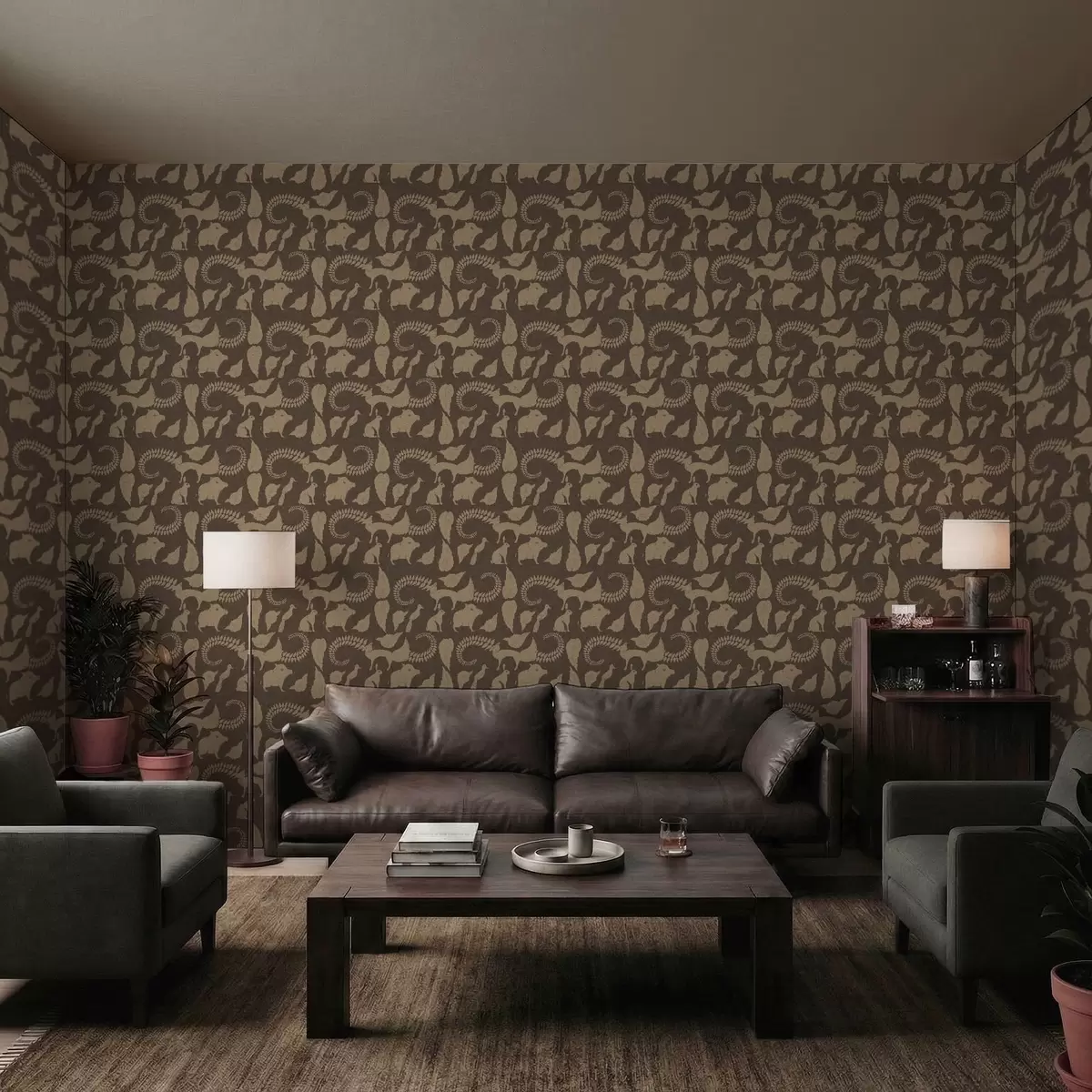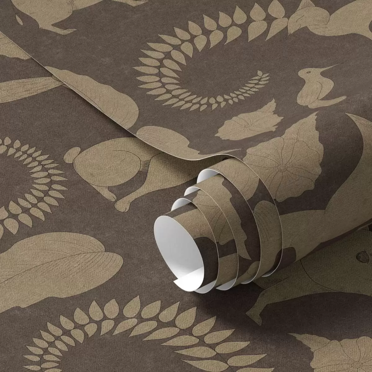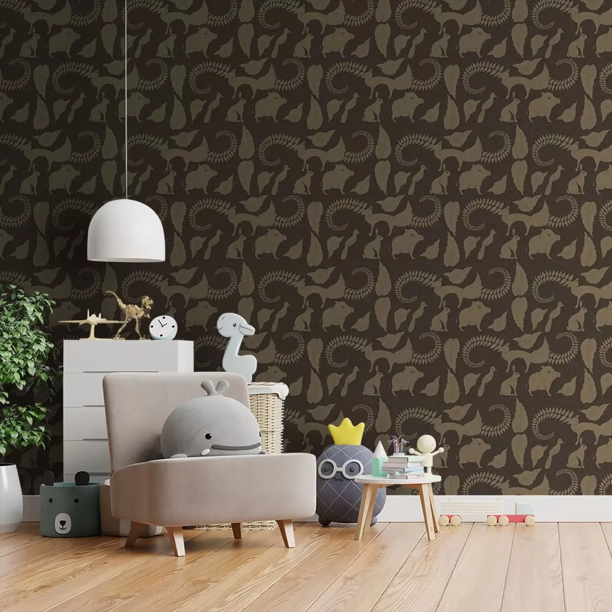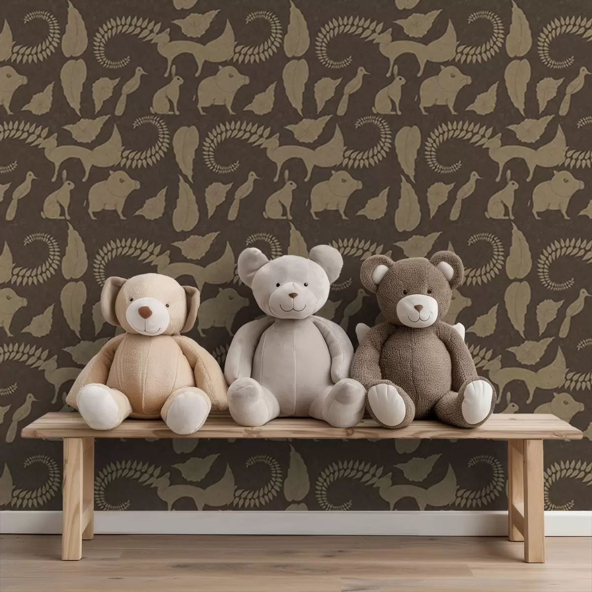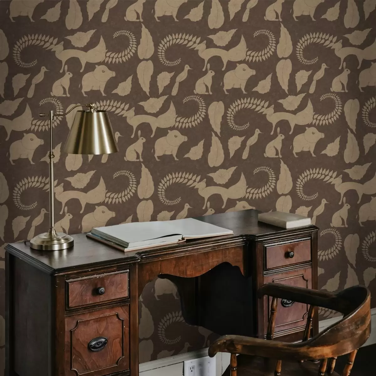 Wallpapers Forest pattern with animals on brown background No. a01121