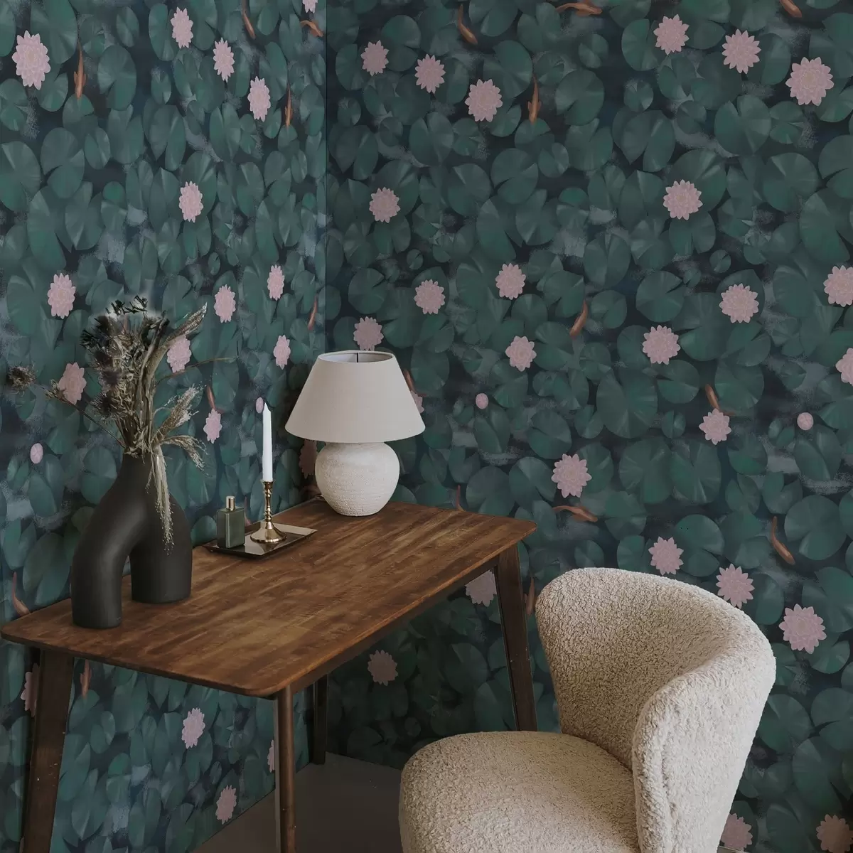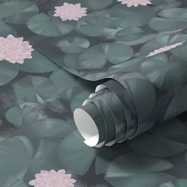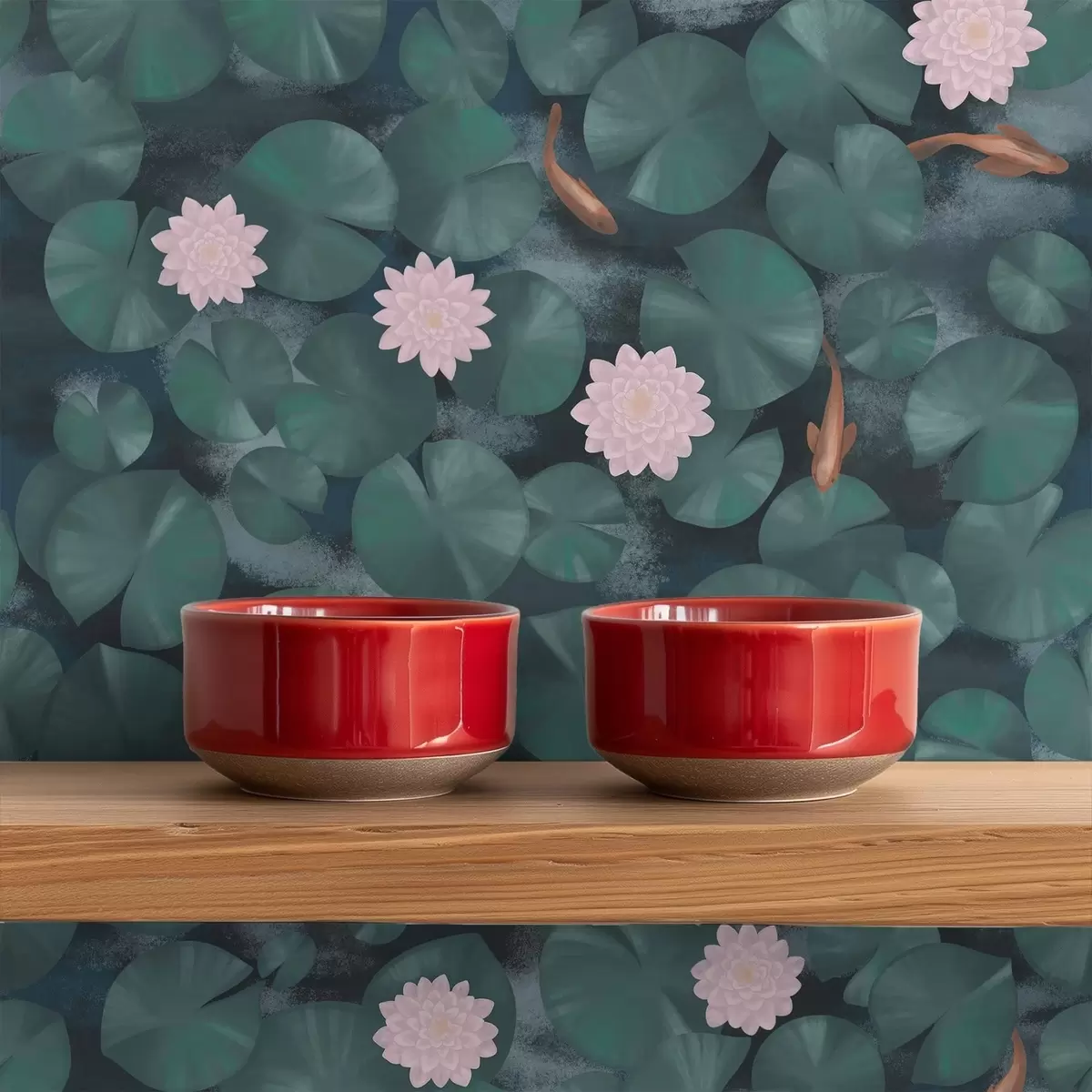 Wallpapers Water lilies with flowers and fish on dark background No. a01177