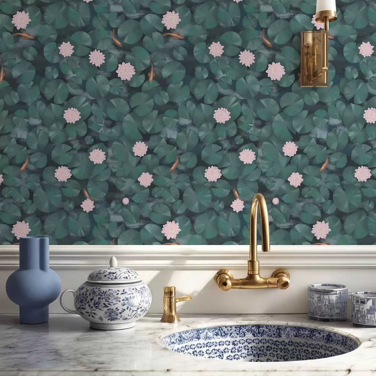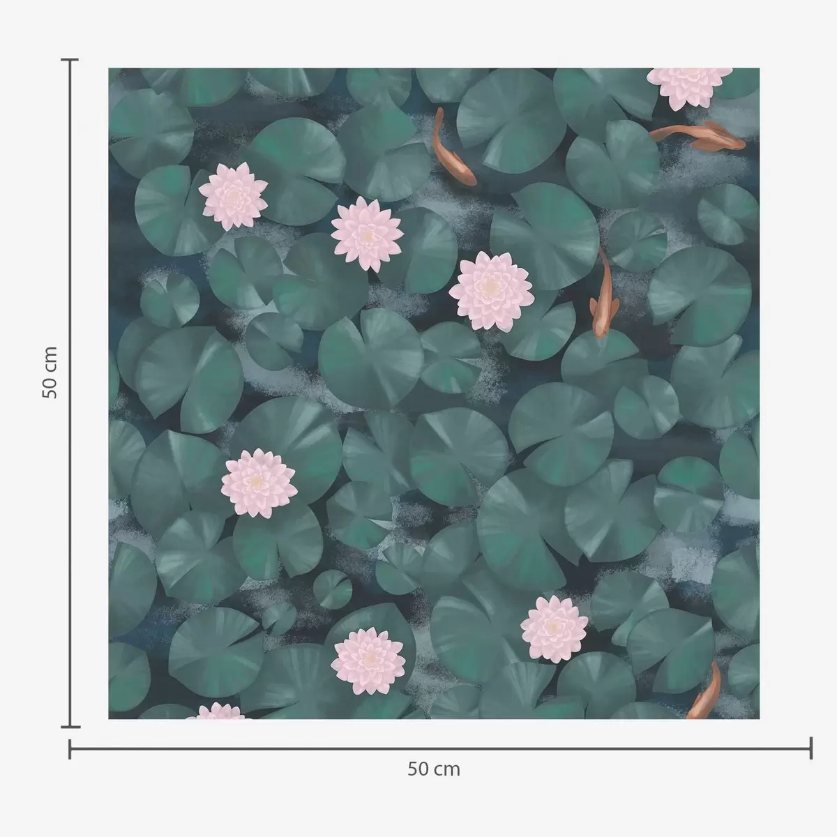 Wallpapers Water lilies with flowers and fish on dark background No. a01177